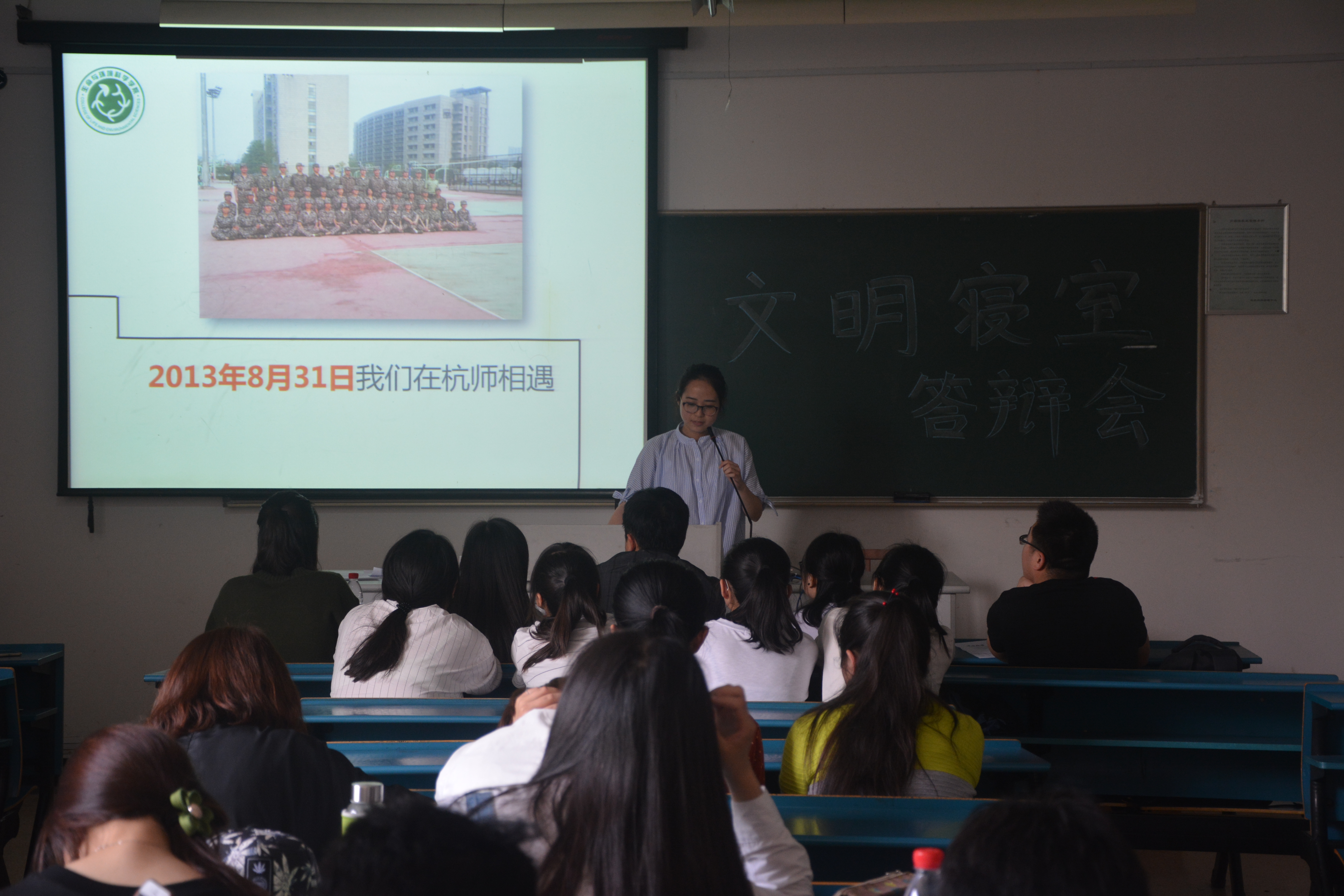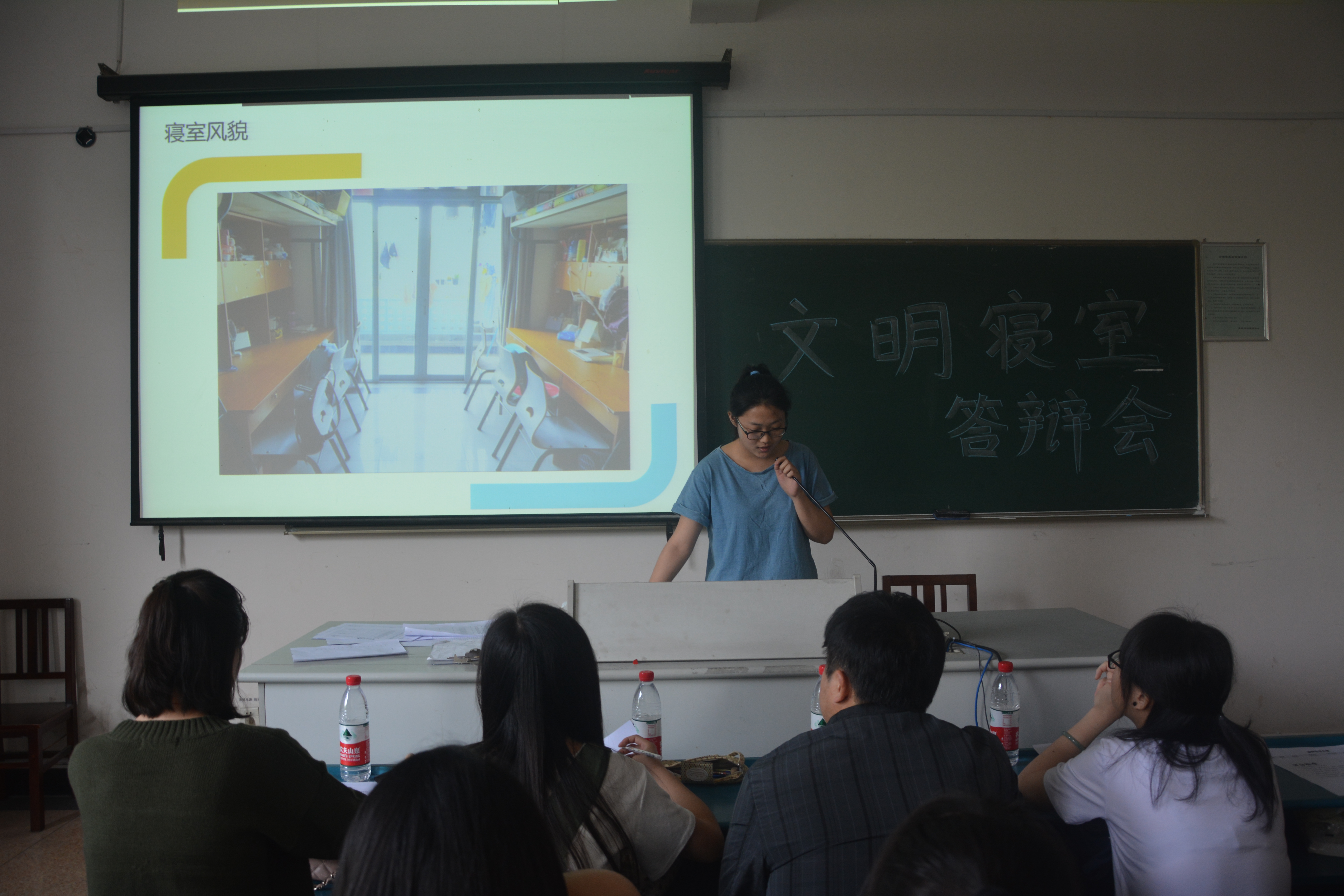 参加本次答辩大会的寝室共有17个,各寝室成员代表都利用PPT生动形象地展示了寝室内部卫生的维护情况以及寝室文化。3-101寝室代表叶卫杰同学自信地展示了男生寝室内整洁的书桌,播放了一段室友才艺的视频,动感的吉他声带动了全场的气氛。他幽默诙谐的讲解,让同学们了解平日里放荡不羁的男生也有细心温柔的一面,诠释了男生之间铁一般的情谊。4-231寝室代表胡佳琪同学以“一屋不扫,何以扫天下”表达她们寝室对于整洁环境的追求,以“以梦为马,不负青春”为核心介绍室友之间相互鼓励,相互温暖,不惧艰难,奋勇追梦的精神。7-214代表单小草同学生动介绍了各个室友的性格特征,并录制了一段寝室的小视频,吸引了大家的眼球,展示了她们寝室的温馨与和谐。各个寝室代表都以新颖的形式,表达自己对于寝室这个温暖小家的依恋与热爱,答辩现场充满着浓郁的爱的气息。