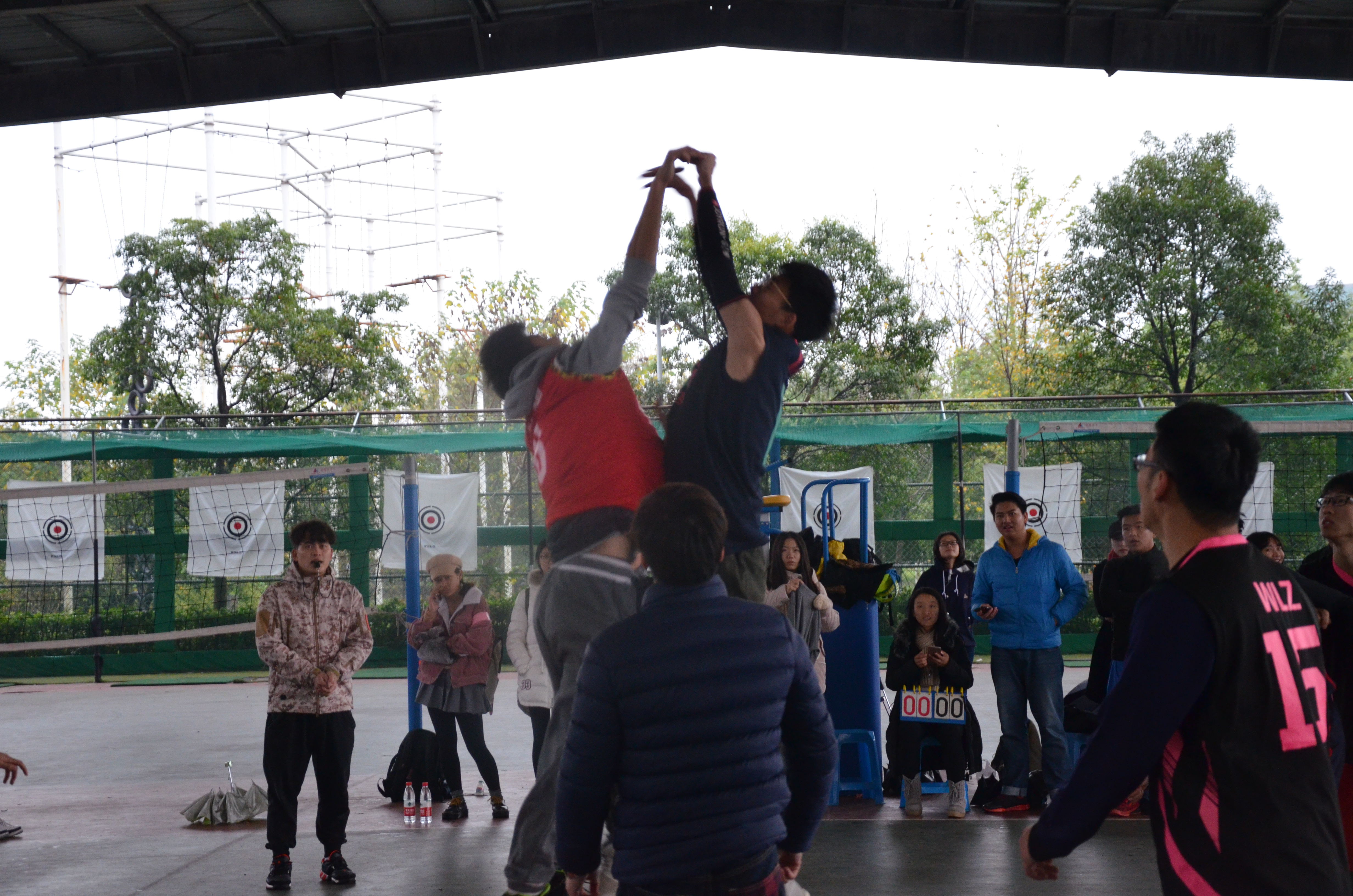 今天气温骤降,飞着小雨,然而双方选手对比赛热情不减。在比赛还没正式开始时,食安151的运动员们就摩拳擦掌,在篮筐下进行投球训练;环工152的同学也在一旁做着准备活动,信心十足。