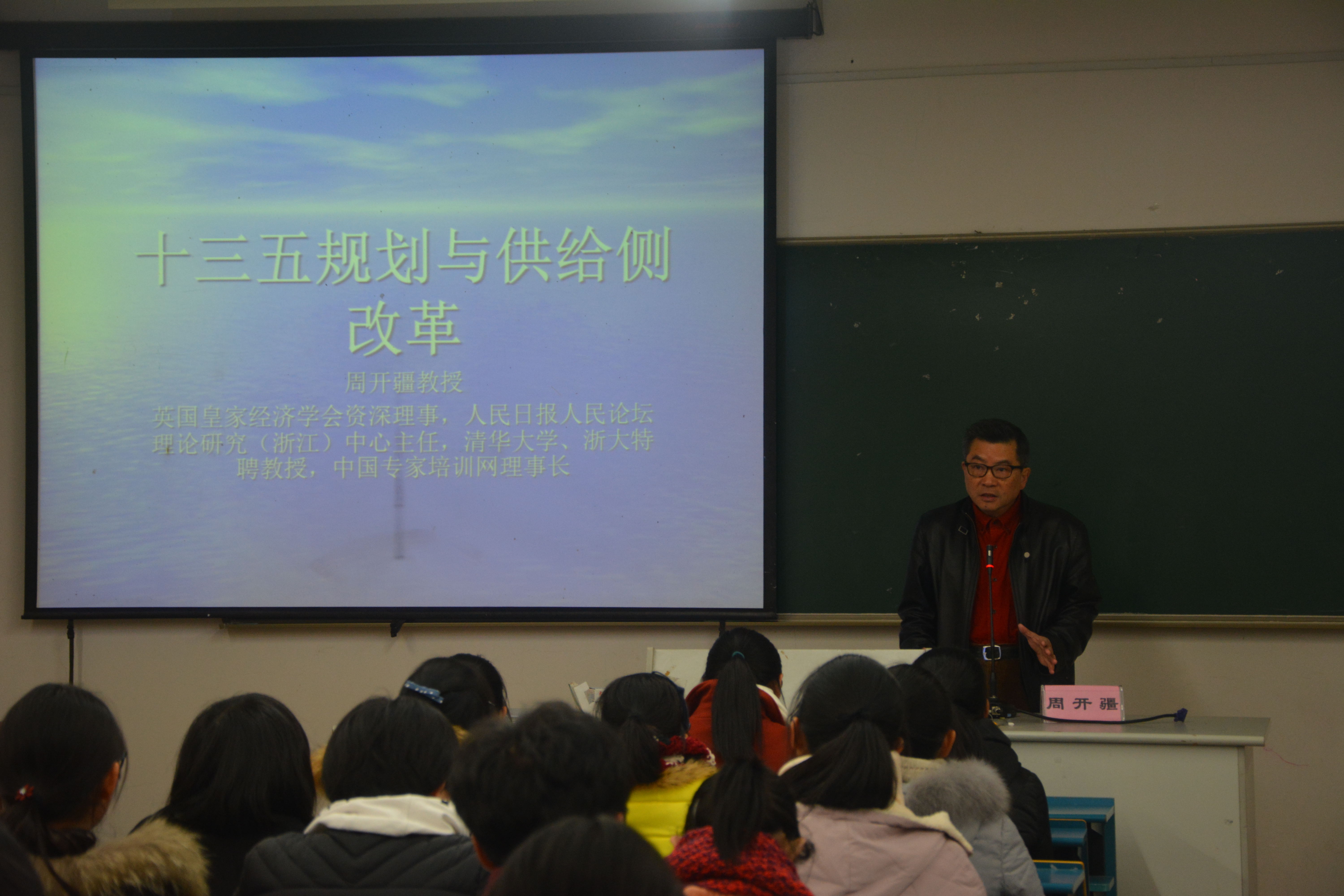 2016年12月14日下午两点,在国产a片 下沙校区教学楼A-215室,英国皇家经济学会资深理事,清华大学、浙江大学特聘教授,杭州市政府经合办主任周开疆为生命与环境科学学院的学子们做了题为《十三五规划与供给改革》的专题报告。