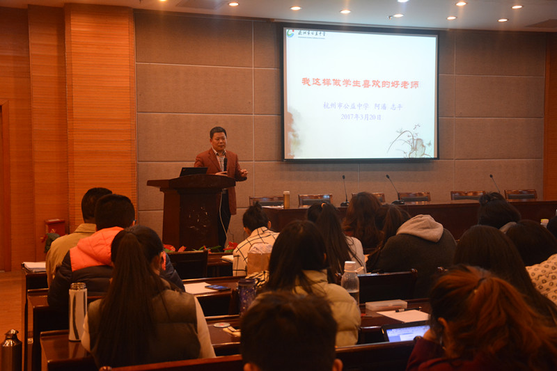 日前,杭州公益中学校长潘志平先生做客“生科问道”大讲堂,为国产a片 本科、硕士研究生以及下沙校区其他专业师范生成功主讲了“我这样当一名学生喜欢的好老师”为主题的学术报告。潘校长以丰富的教学实践和管理经验,分享了他与学生之间的故事,诠释了如何做一位好老师、办学生喜欢的学校、做有真情的教育,博得了师生的阵阵掌声。