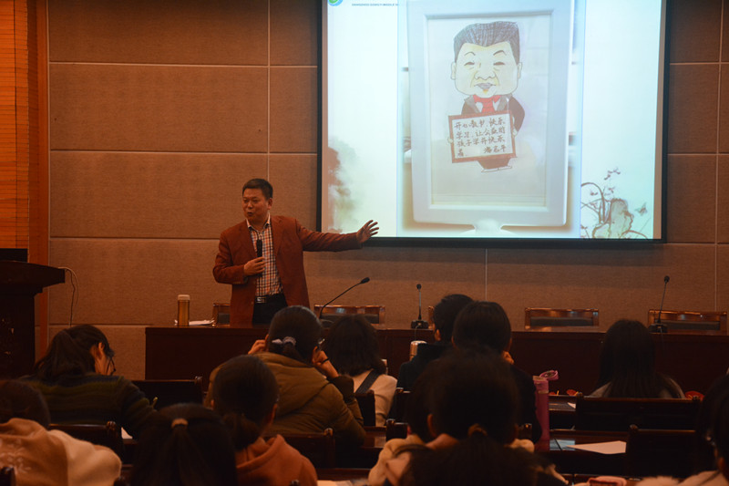 首先,潘校长提出“什么样的老师是好老师”的问题。他认为学生喜欢的就是好老师,并用自身的经历分享与学生之间的故事,总结了与学生沟通的点点滴滴,娓娓道来,如数家珍,他详细介绍了自己如何主动与学生打成一片,和学生一起打“群架”、一起玩三国杀,学生亲切的称呼他为阿潘校长。潘校长说学生因此很喜欢他,喜欢他就会喜欢他所教的科目、所带的班级,就会心情愉悦地把书读好。