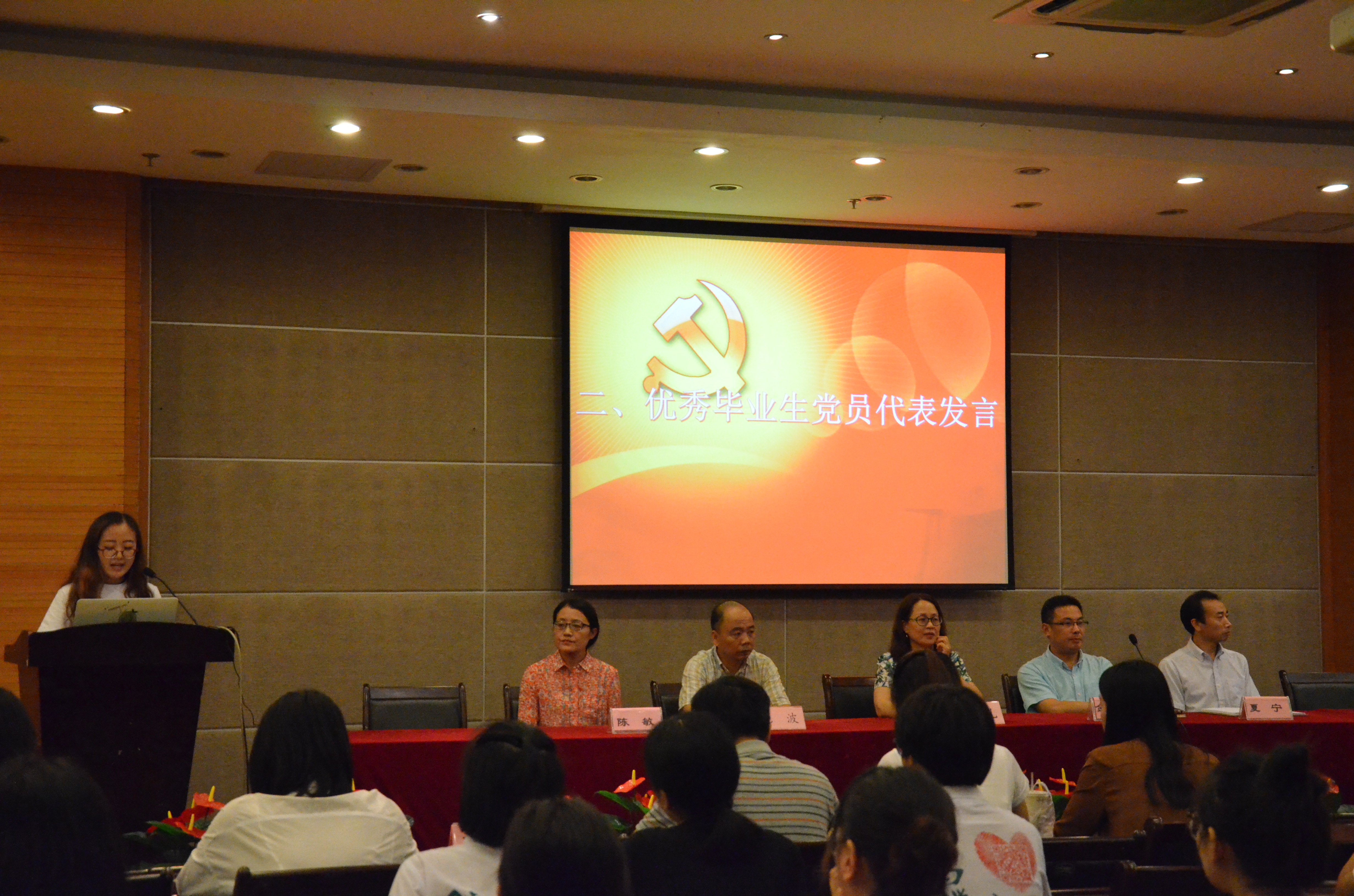 2017年6月20日下午,国产a片 于下沙叙伦厅召开2017届毕业生党员大会。出席会议的院党委领导有:学院党委书记周春儿,党委副书记金岳祥,党委委员、副院长沈波,党委委员陈敏、夏宁、程心皓以及各学生党支部书记。大会由组织员倪雅主持。