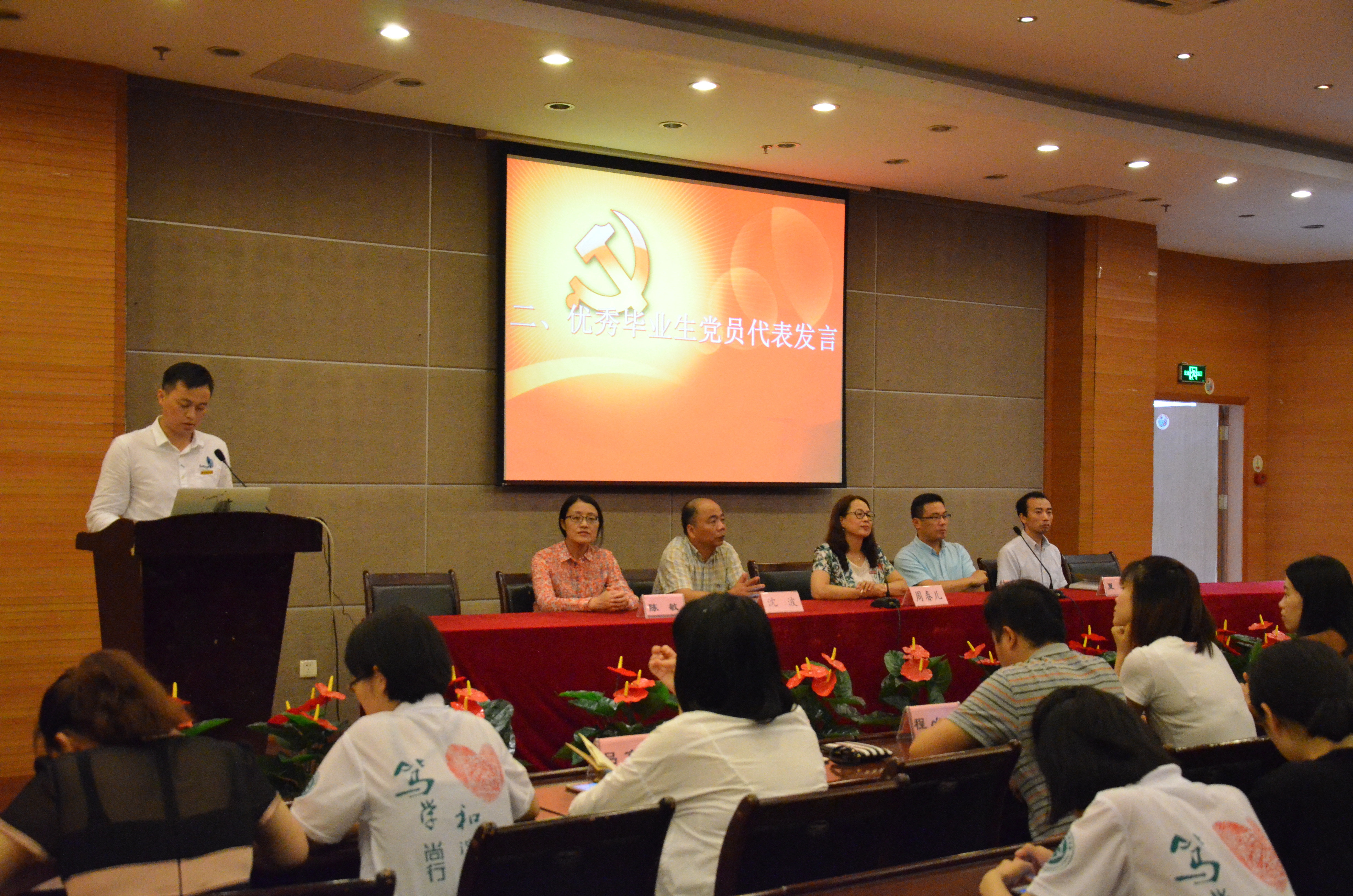 首先,全体毕业生党员在金岳祥副书记的带领下,面对党旗,重温了初次入党时许下的誓言,回忆重现,让所有在座党员再次感受了第一天入党时的激动心情,也再一次让入党誓言牢牢刻在了同学们心里。随后本科毕业生党员代表田兰馨以及研究生代表李智,各自讲述了在杭师大党员生活的点滴和感受。田兰馨讲到,大学生活就像一个熔炉,燃烧出每个与众不同的精彩人生。自己从干部到干事,从团员到党员,收获了很多,也感谢老师们一路的领导。而研究生李智则讲到无论在学校还是社会中,各位党员应始终用党的理论来武装自己,不断加强思想政治建设,提高自身的修养,不久他也要赴西藏投身志愿者工作,在未来的学习、工作中,他会不断提高自身素质与能力,不断前进。然后,陈思同学作为毕业生党员代表,发起了毕业生党员文明离校的倡议,希望2017届全体毕业生党员践行职责,做最文明的毕业生;积极总结反馈,做最理性的思考者;投身志愿活动,做最热情的奉献者;常怀感恩之心,做最有心的杭师大学子;牢记教诲,做最坚强的奋斗者。