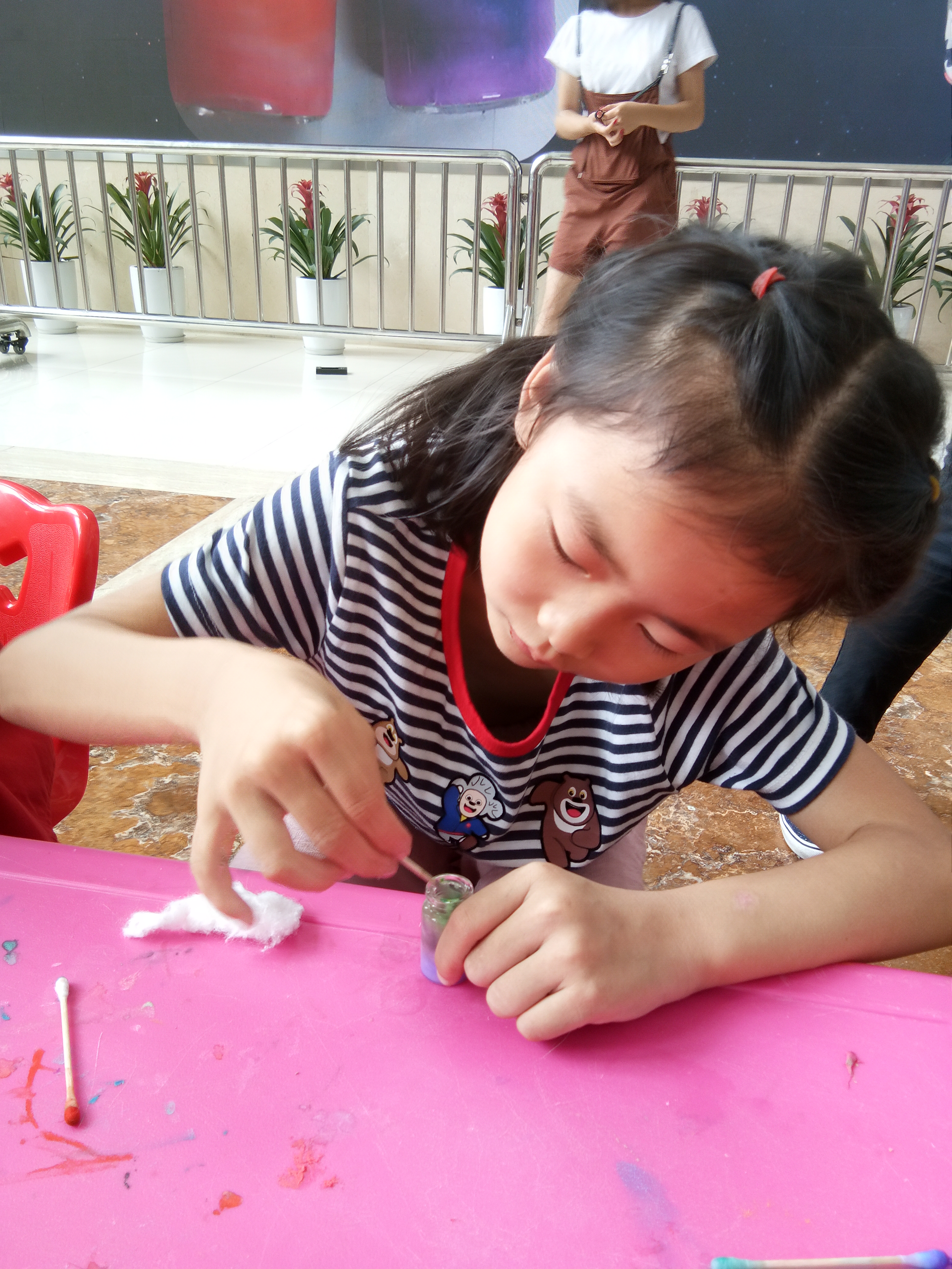 看似小巧的瓶子实则精细,看似简单的步骤实则需要耐心细心。而到场参加活动的小朋友们都能在队员的帮助下按照老师的步骤耐心并且认真地制作星云瓶,很多小朋友都成功地完成了制作。而年龄较小的小朋友则能在家长的陪同下一起制作。这小小的星云瓶不仅能体现小朋友对色彩的辨识度和提高小朋友的色彩搭配技艺,更能考验小朋友的耐心与细心。虽然是第一次制作,手法生疏,但每一位小朋友的成果却都有着别样的美。
