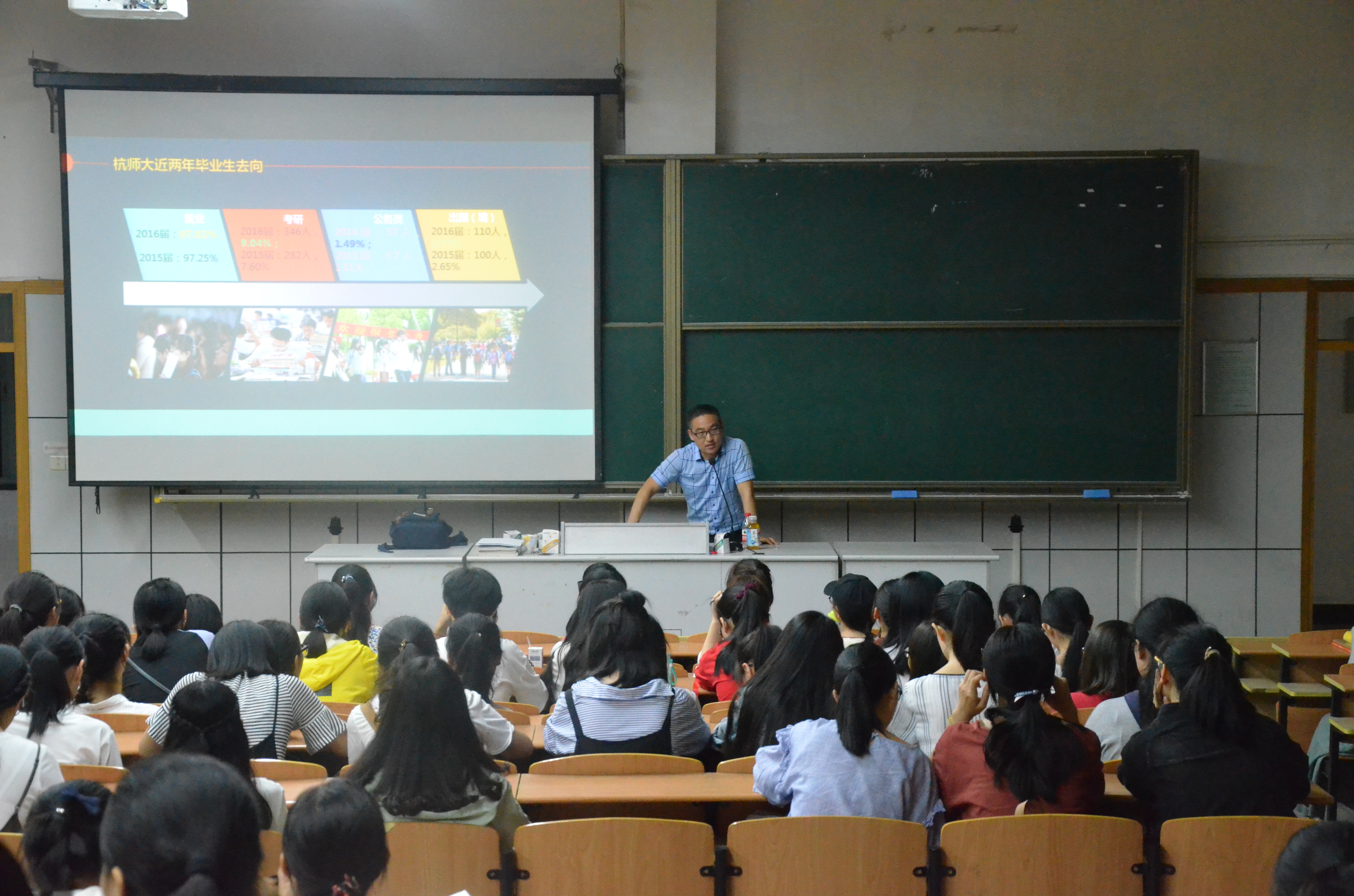 曹老师先是向同学们展示了近几年来我校整体的毕业生动态去向,在就业压力巨大的背景下,此次的“中美合作交流项目”为我校学生提供了一个更加宽广的平台,使得毕业不再是失业,而是:毕业走向世界!四年的大学生活,不长不短。曹老师鼓励在座的学生要有这方面的理想,憧憬。出国留学要求学生都需要有较高的综合素质,而不仅仅只是掌握英语的听说读写。目前来说同学们可能达不到这样的要求,但是至少学校可以为同学们提供这么一个选项,供同学们选择,而我们也可以朝着这个目标去努力,奋斗。对于未来大学四年的学习时光,同学们要有世界的眼光,站在一个比较高的平台上眺望远方。来到杭州读大学,最应看重的不仅仅是能不能毕业,拿到文凭,更应是认真思考四年后我们能收获什么,我们能为自己的人生做什么。曹老师还列举了上海纽约大学,深圳北理莫斯科大学等例子,说明中外活动办学无形中影响着在座的每一位同学。我校留学生不断增加,与国家政策密不可分。这已不只是教育界的事情,更是国家与国家间关系的影响。曹老师还呼吁同学们在空闲时间去其他中美合作交流的学校参观学习,感受不同的文化背景。最后曹老师还给同学们介绍我校交换生,暑期修学项目,以及我校的121国际交流项目等项目。