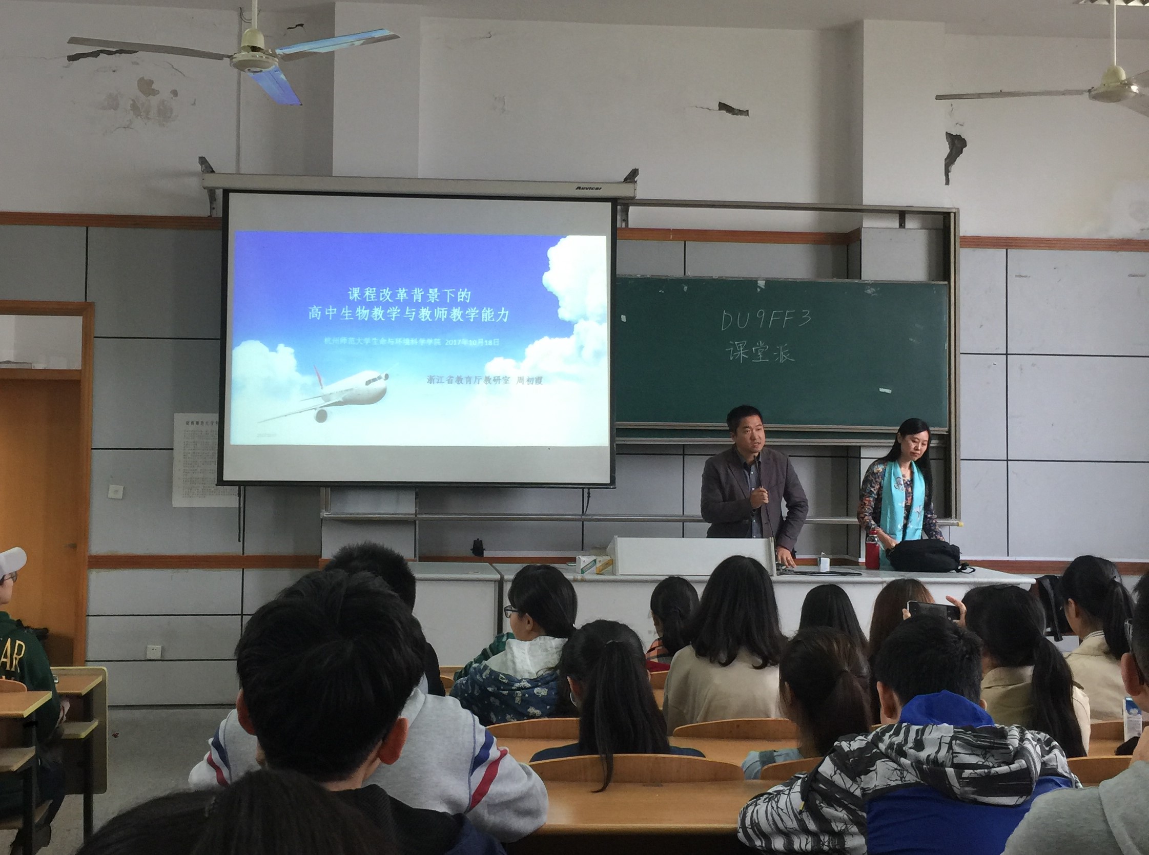 2017年10月18日下午,国产a片 邀请了优秀校友周初霞老师(90届生物学教育专业毕业生,浙江省教研室生物教研员,生物特级教师。曾获谈家桢生命科学园丁奖、诸暨市优秀教师、诸暨市十大优秀青年等荣誉称号),为大一、研一新生开展了有关“生物教学”的讲座。本次讲座主要围绕以下三个方面来讲:首先是传统教学模式与未来教学模式的对比,其次是以七选三为背景的深化教育体制改革,最后是有关生物课程的改革与创新。