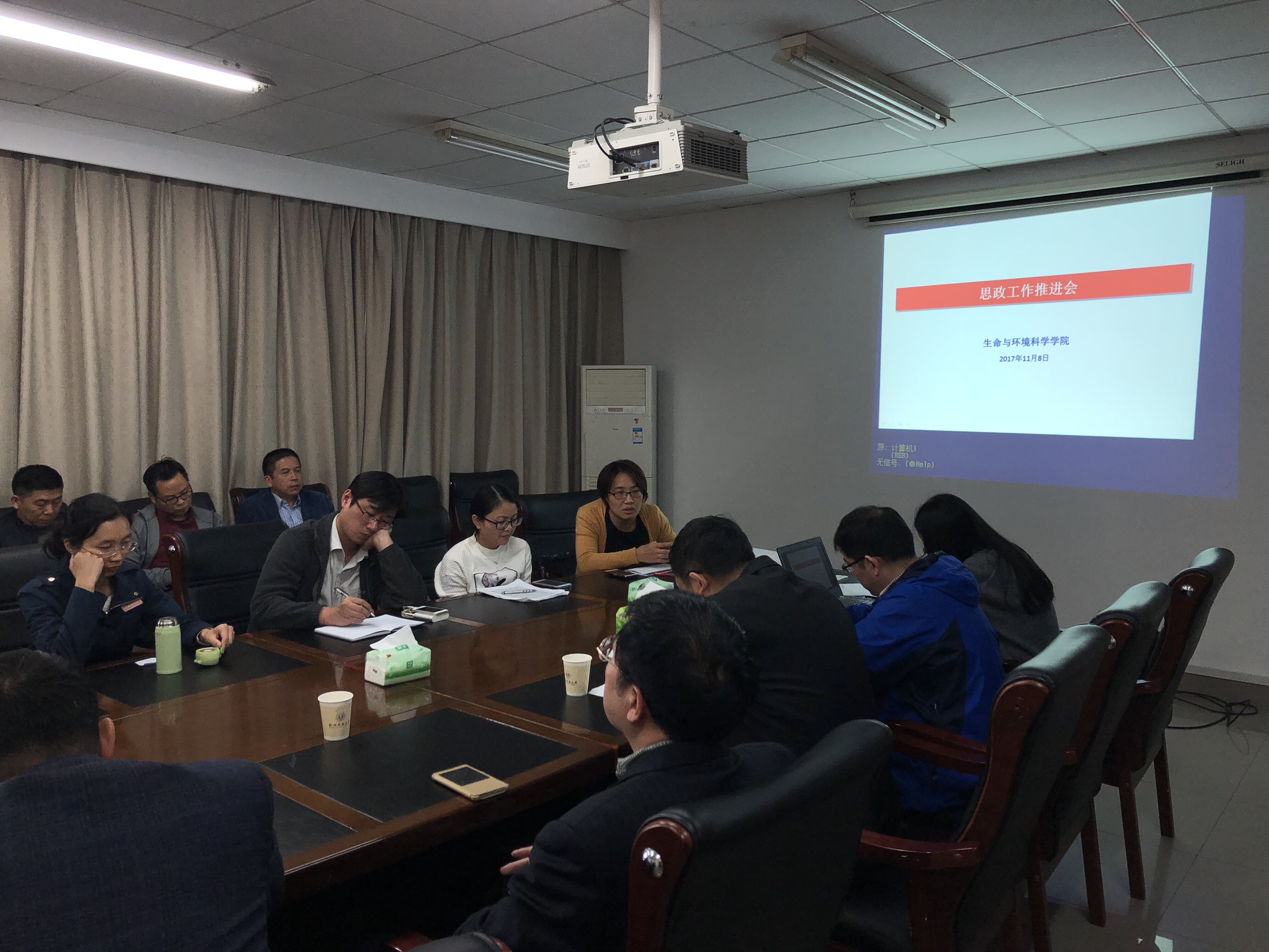 11月8日中午,生命与环境科学学院在行政楼804会议室召开思想政治工作推进会,会议由党委副书记余洁主持,院领导班子、班主任代表、学生代表参加此次会议,研判生命与环境科学学院当前思想政治工作领域总体情况,解读工作格局构建相关文件和意见征求。