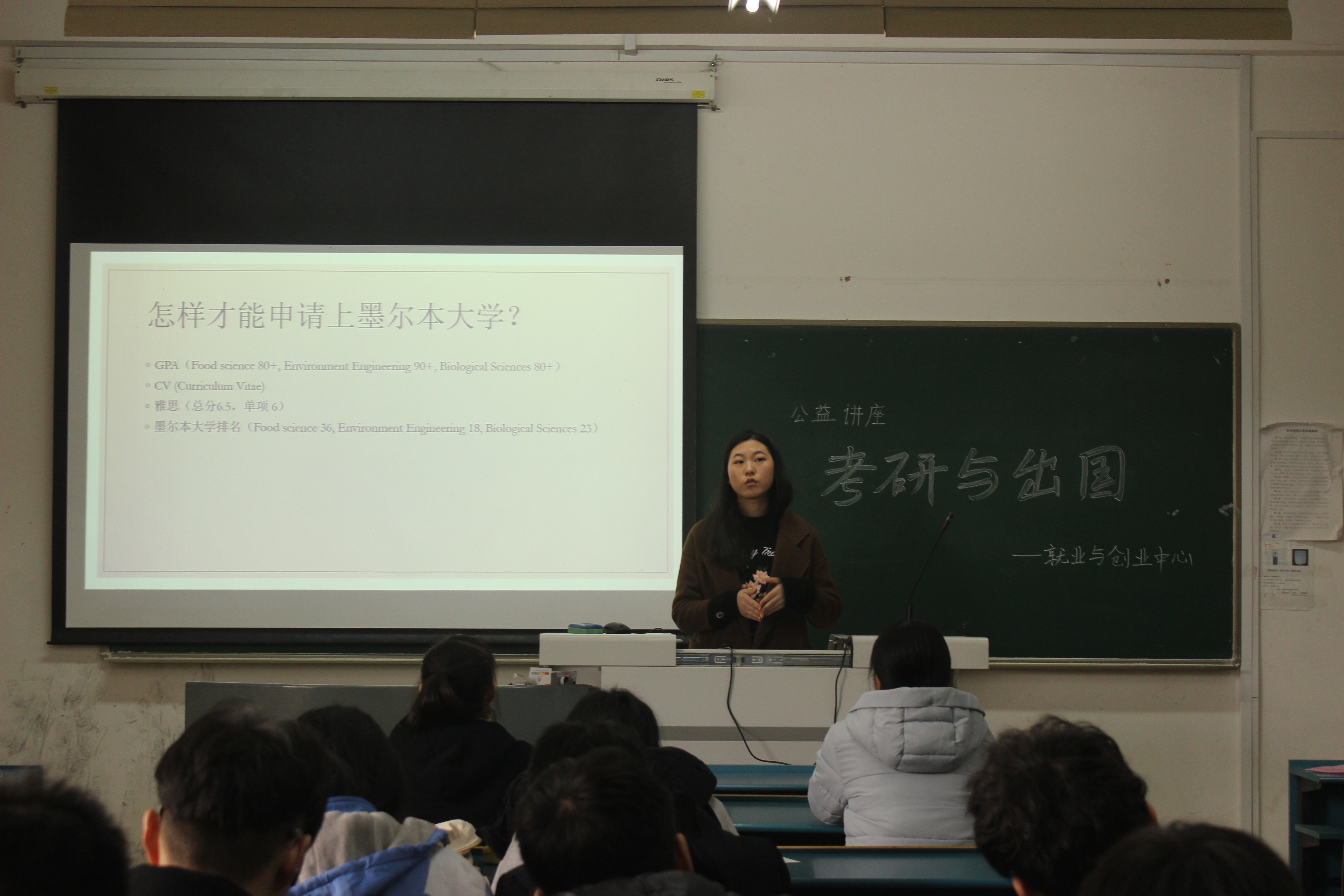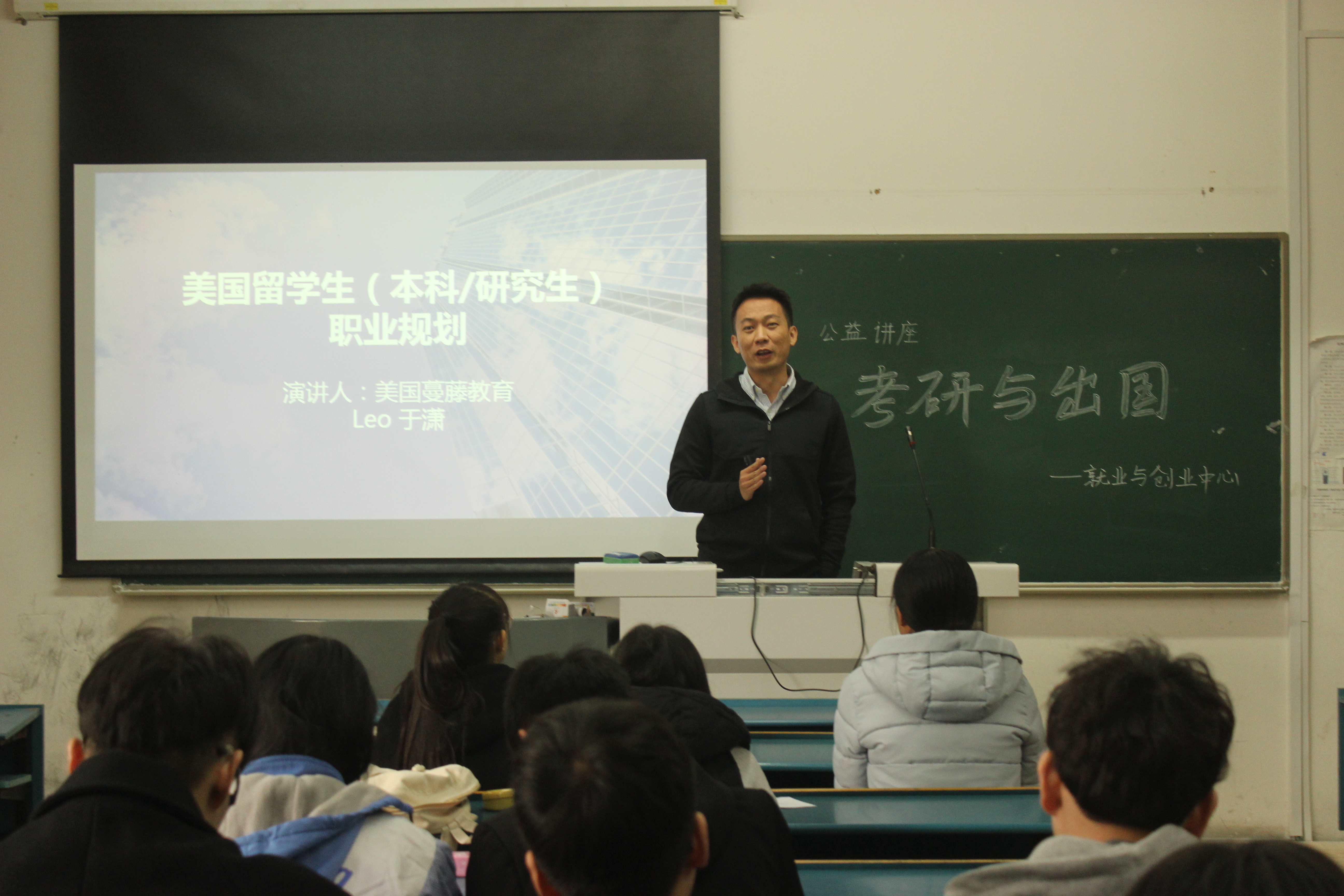 2017年12月6日下午,国产a片 邀请了我院2016届校友柳安(墨尔本大学在读研究生)、美国蔓藤教育华东区总经理于潇老师和点对点教育的陈老师于教学楼A—107举行了有关“考研与出国”的公益讲座。