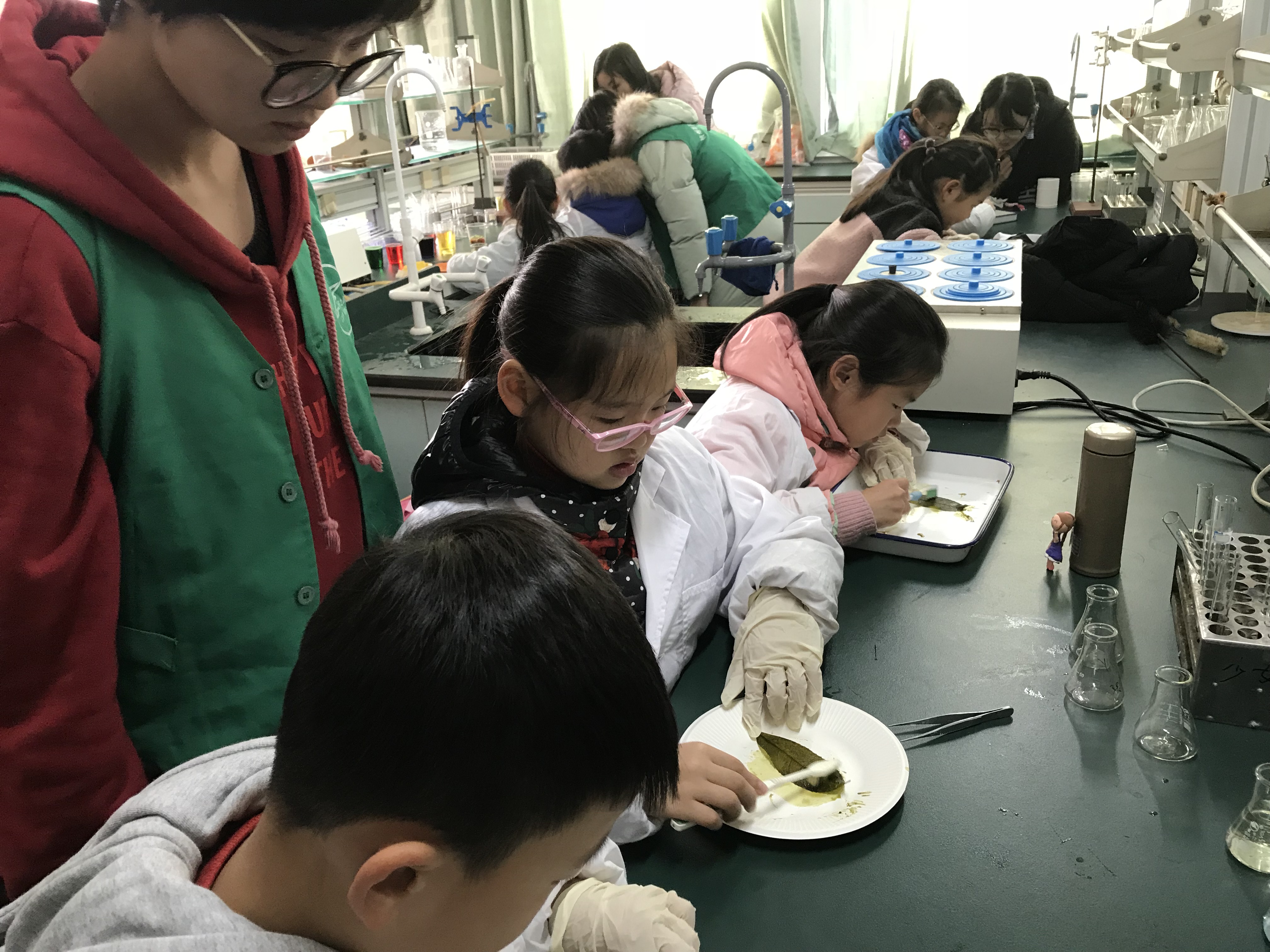 活动正式开始前,由“绿之翼”组织带领小朋友到实验室先进行准备活动。小朋友们热情高涨,穿好志愿者为他们准备好的实验服,坐在自己的位置上,期待地看着实验室里的器材。在简单介绍了小实验的步骤后,活动正式开始了。几个实验以水为基础而展开,让小朋友亲身感受水的魅力,从而领悟到水源的重要性。活动现场,每个小朋友都十分积极地做实验,虽然是三个人一小组,但每个组的小朋友都争先恐后,活跃度十分高。小朋友总会提出稀奇古怪的问题,也会有些令人震惊的回答,“你知道为什么它们不会融汇在一起吗?”“不知道,就像你不知道为什么夸克是最小的粒子一样”,他们的想法天马行空,令志愿者们刮目相看。小朋友的认真参与让这几个小实验都做得十分成功,他们也对自己的成果表示满意。