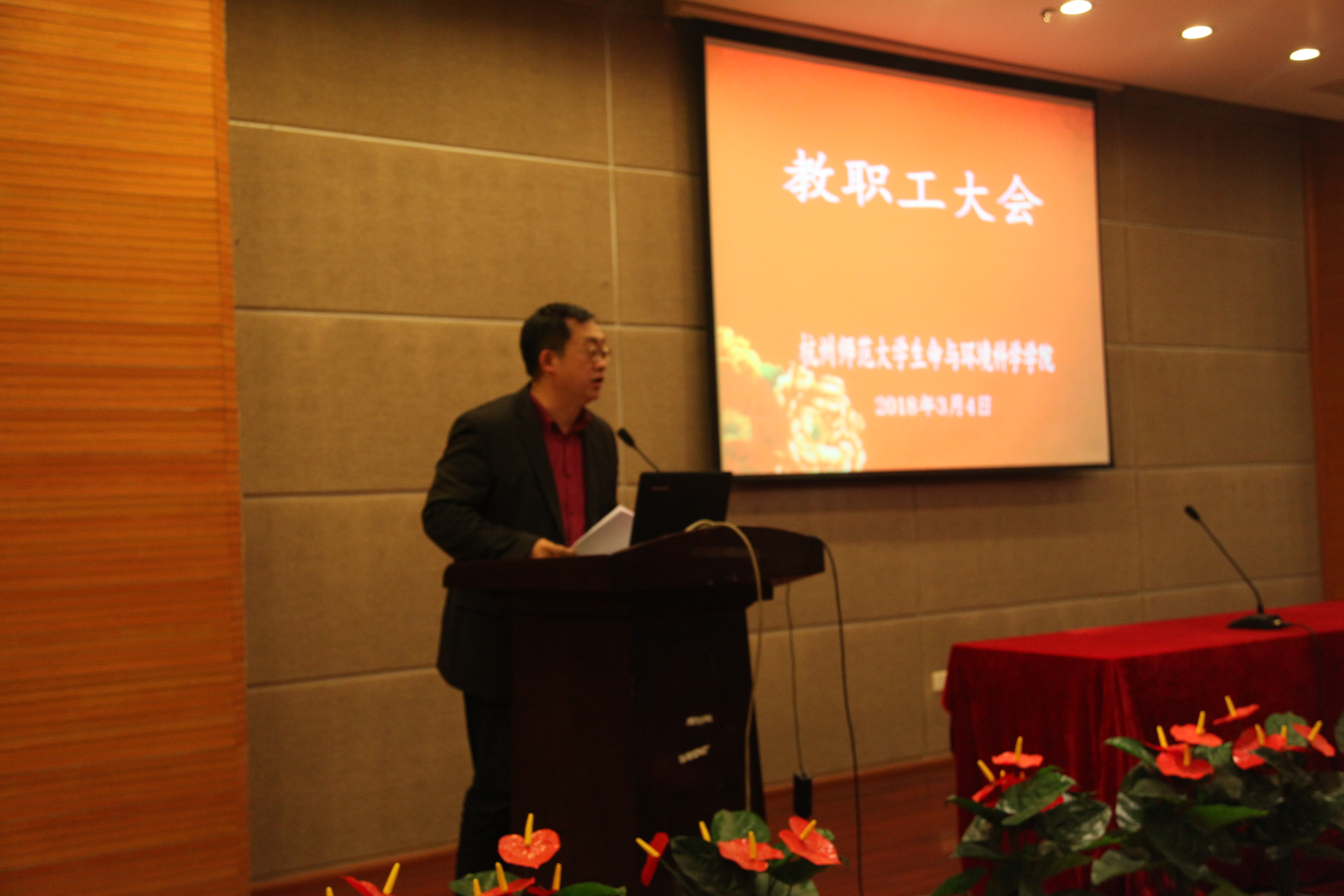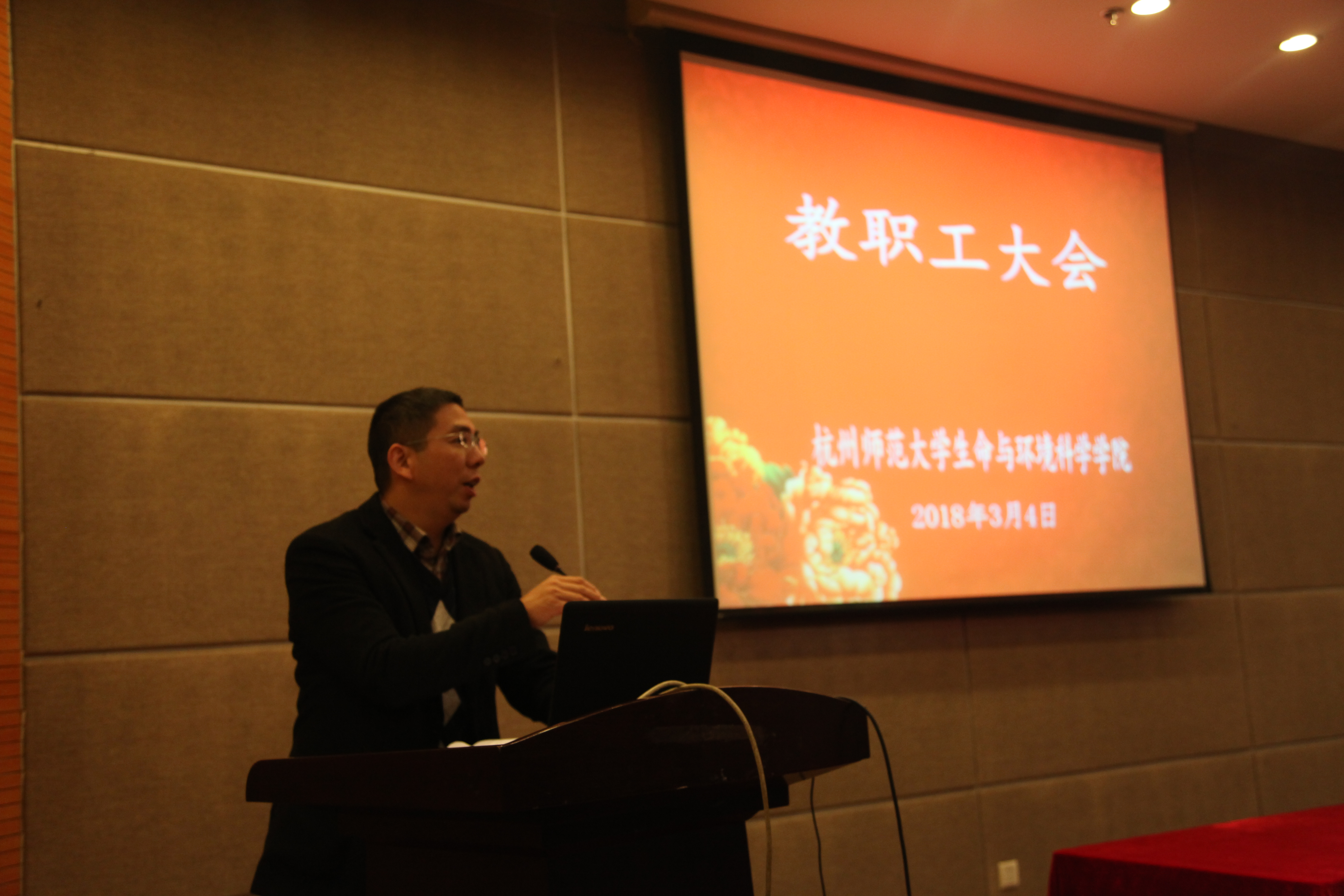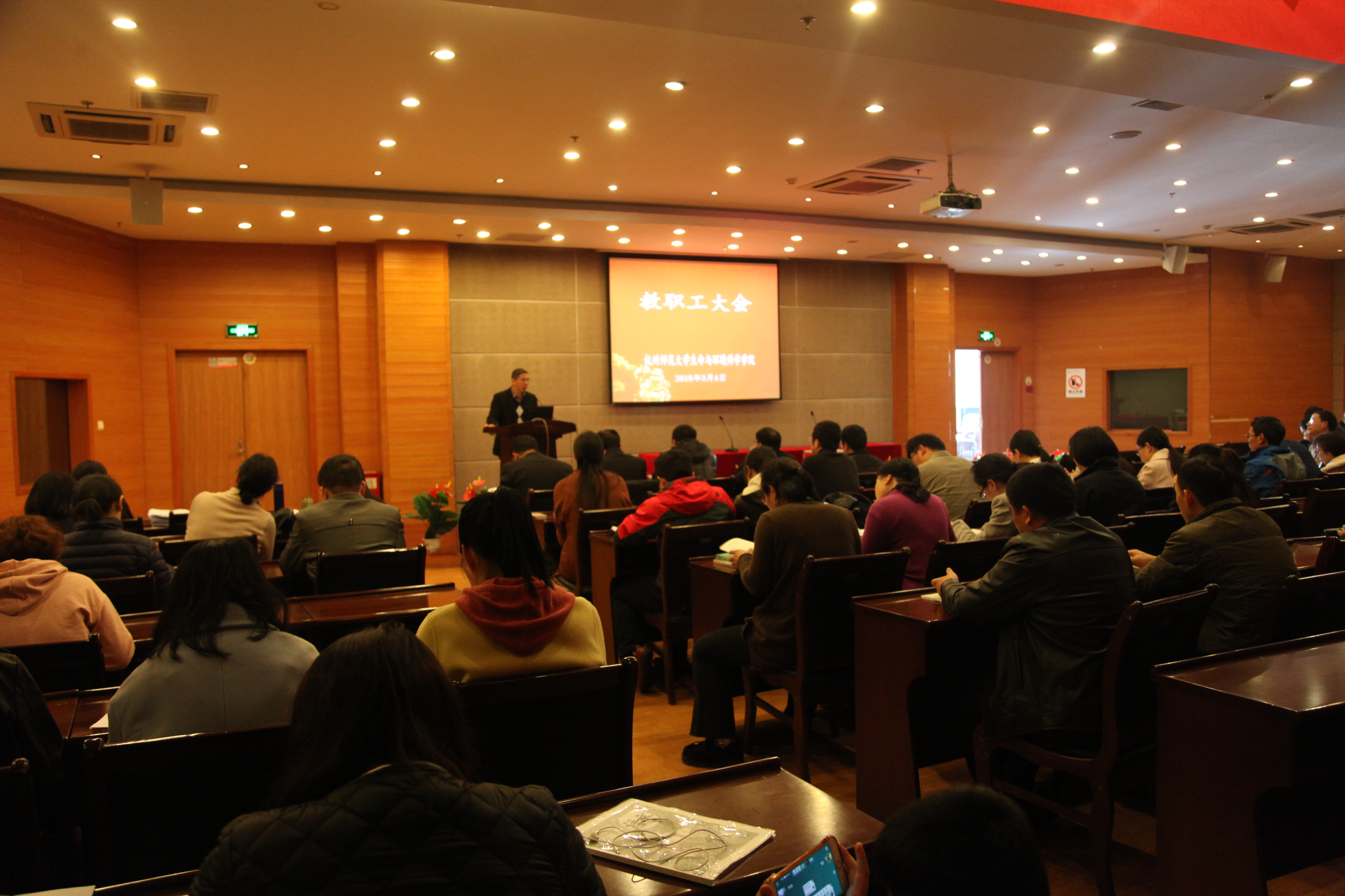 其后,王院长向全体教职工传达了校党委书记陈春雷在学校2018年工作会议上的重要讲话精神,并对过去一年工作进行了回顾,对上学期学院完成的主要工作进行汇报,并对存在的问题进行了分析,提出了新学年行政工作要点,强调学院工作要以规划为引领、人才为抓手、学科为龙头,积极充实内涵,寻求新的突破,勉励大家新的一年群策群力,助力学院新的发展。