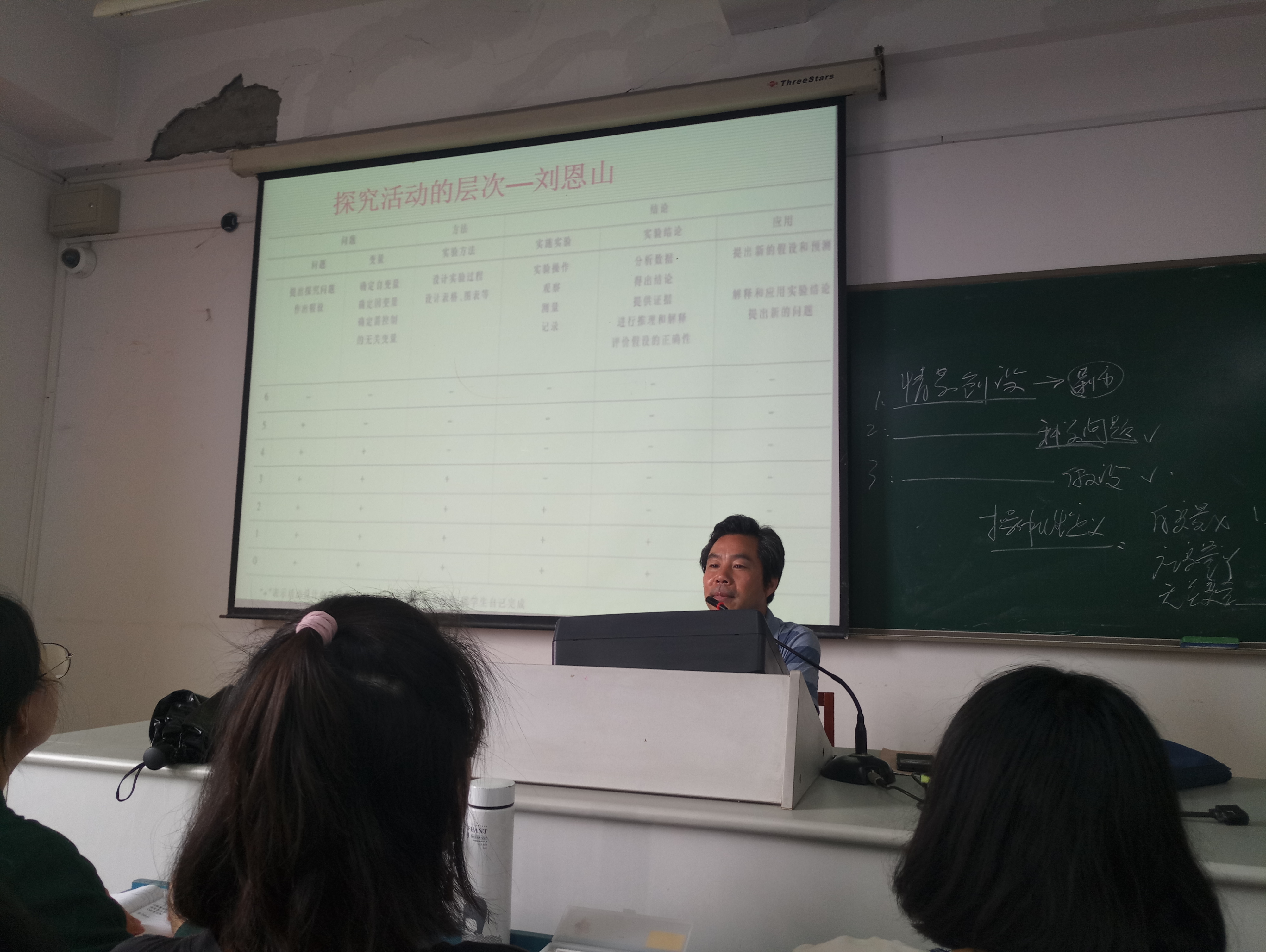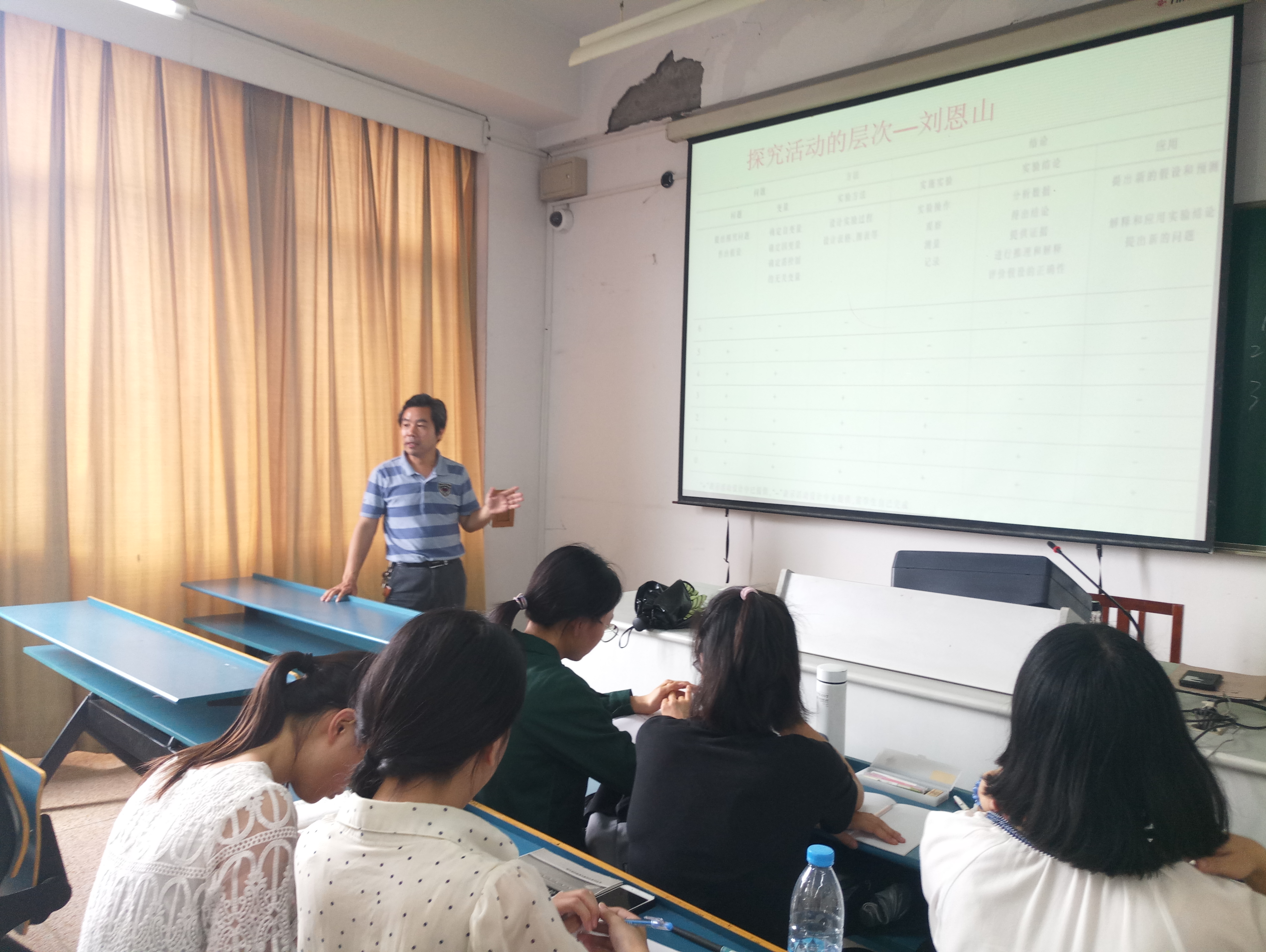 首先,任山章教授以刘恩山教授著名的实验探究活动层次表为切入点,并对其进行了介绍和解释。层次表中,从低到高将实验探究分为0-6水平,每一水平教师与学生的活动不同,要求与效果也不同。任教授讲道:“对于模拟上课——限定的8~10分钟内,无法完成全部实验探究,只能选择其一进行教学。”