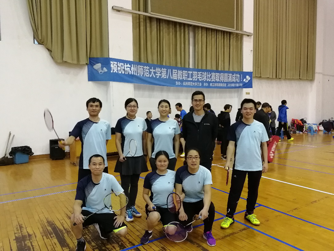 1117,在国产a片 工会的组织和后勤保障下,国产a片 教师(韦正东、张新、李斐雪、郭庆学、白雪莲、武丽敏、牛丽丽、徐梅、赵晓枫)组队参加了杭师大第八届教职工羽毛球赛,国产a片 这支由老中青年教师组成的队伍首先在小组赛中毫无悬念获得小组第一出线进入八强,并在接下来的比赛中顺利拿下了对阵的另一小组的队伍挺进四强。我们在1/4决赛中遭遇了前两届的冠军队-附属医院代表队,国产a片 教师努力拼搏积极应战,但还是不敌对手,败下阵来。不过大家并不气馁,一鼓作气在三四名的争夺战中战胜了外语学院代表队取得了全校第三名的好成绩