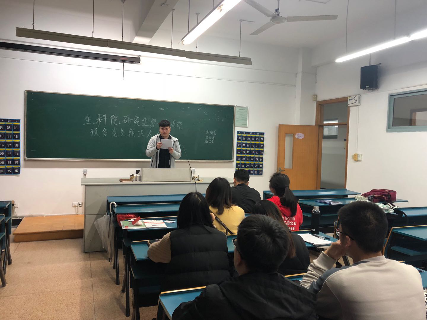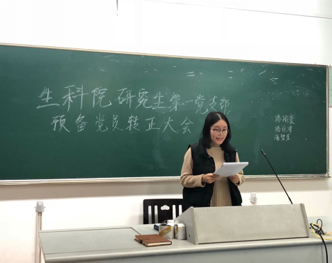 2018年12月3日16:50,生命与环境科学学院研究生第一党支部预备党员转正大会在教学楼a楼213准时召开。研究生第一党支部书记岳龙华老师出席并主持了本次会议。经过一年的考察,骆丽清、骆瑜豪、潘碧莹共三位同志通过支部大会讨论并按期转正。