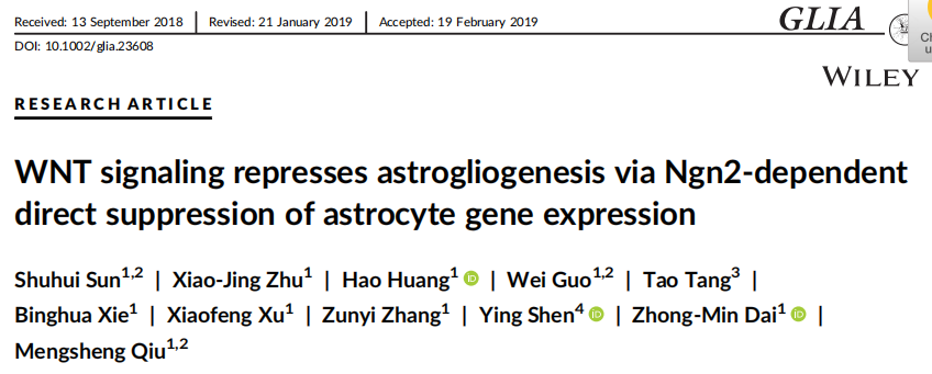 2019年3月19日,国产a片 邱猛生团队在 Glia (影响因子:5.846)期刊在线发表题为“WNT signaling represses astrogliogenesis via Ngn2-dependent direct suppression of astrocyte gene expression”的研究论文,揭示了WNT/β-catenin 信号通路通过转录因子Ngn2抑制星形胶质细胞发育的调控作用。