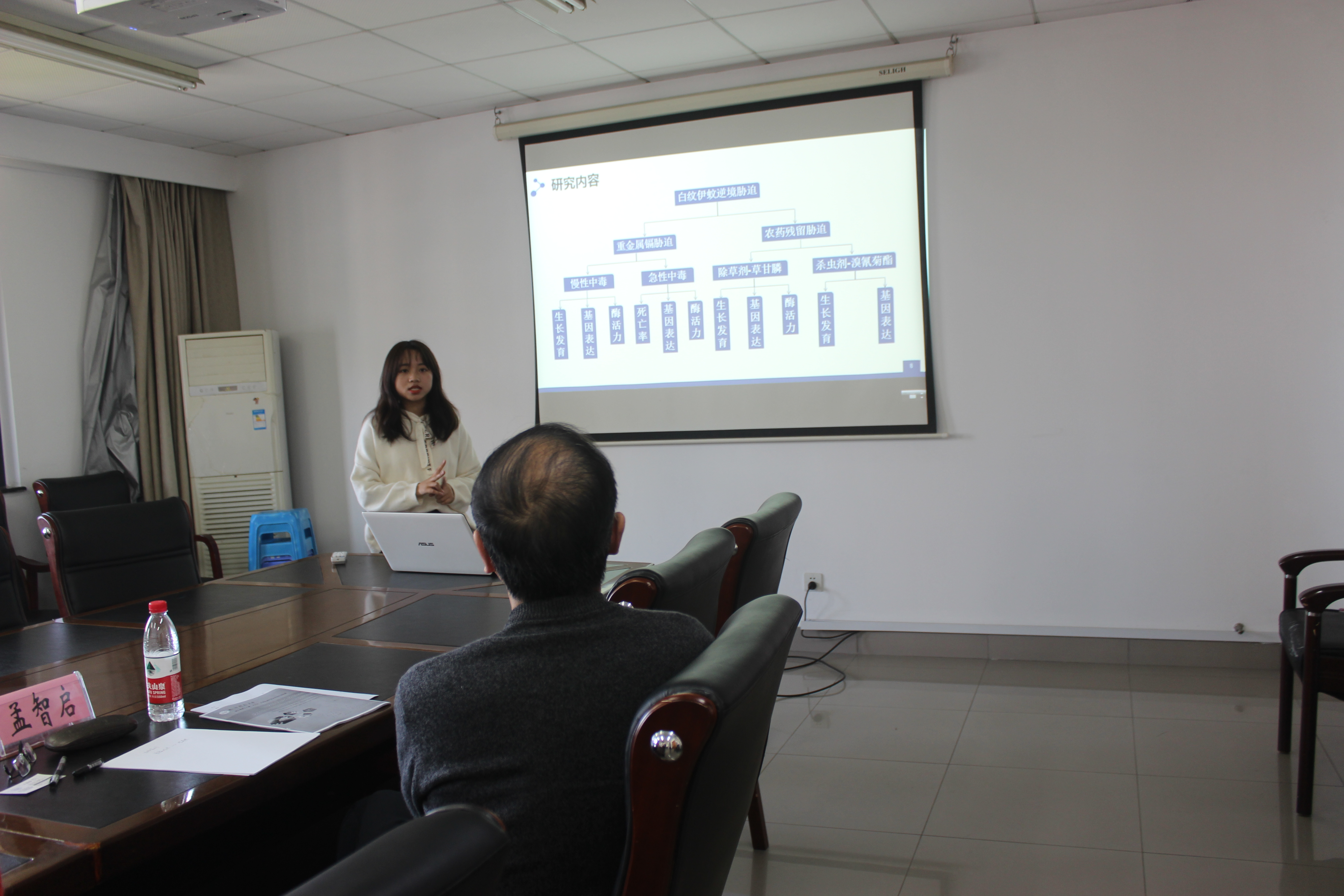 首先,由包雪钗、王琪玮团队进行白纹伊蚊对水体重金属及农药残留胁迫的应激响应机制的演说答辩。该项目揭示了白纹伊蚊对生物监测和疫病防控的影响,探究了白纹伊蚊对重金属镉慢性、急性中毒胁迫的应激性响应和白纹伊蚊幼虫对水体草甘膦、溴氰菊酯残留胁迫的应激性响应研究的作用,评估了在生物监测方面的创新之处。