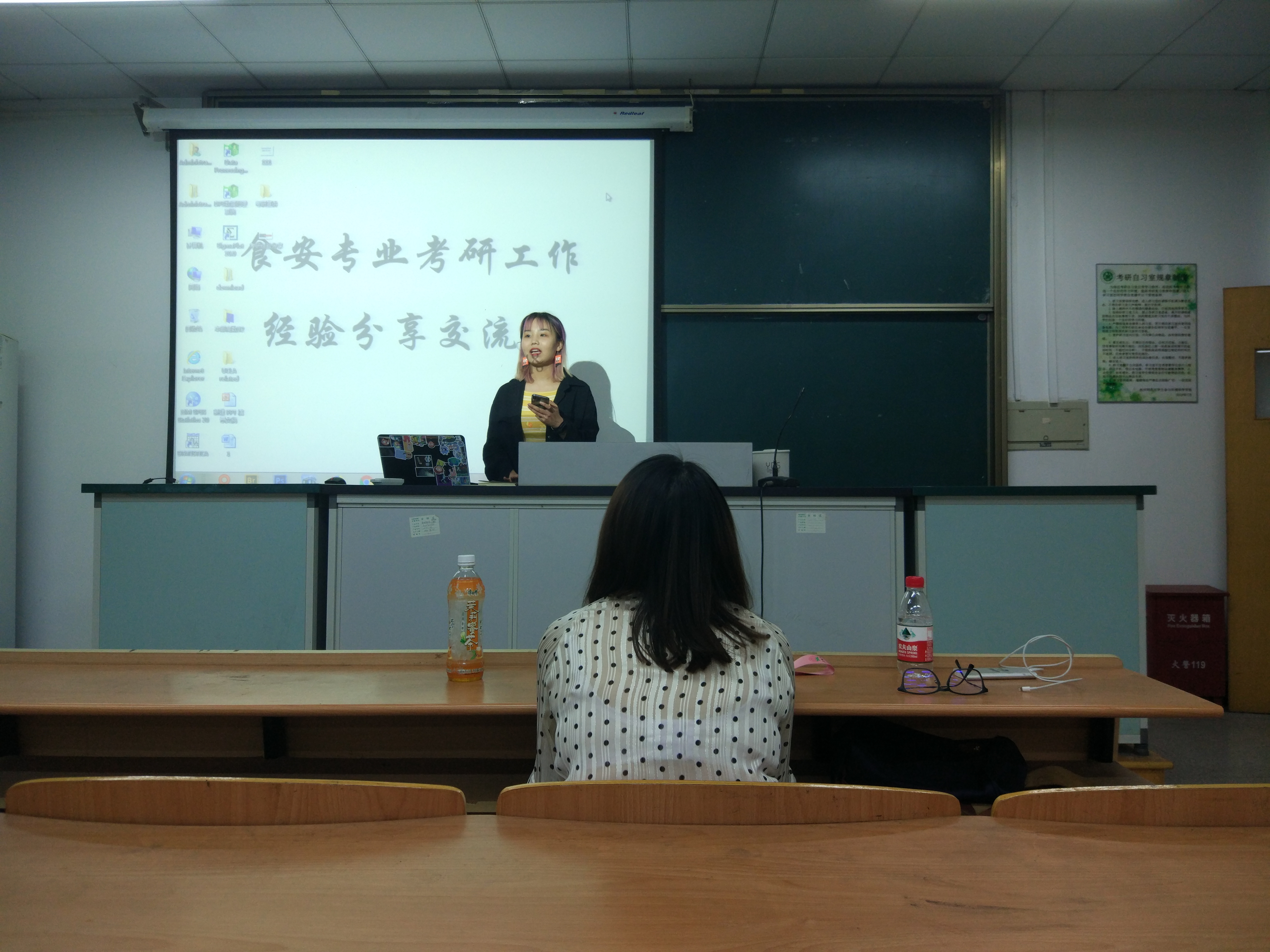 第一位上台分享考研经验的是被吉林大学录取的柴家乐学长。柴家乐学长从考研原因、如何择校、准备初试等几个方面,全面地为正在准备考研的食安学子提供了十分具有指导性、针对性的建议。帮助正处于备考阶段的食安学子驱散了前方的迷雾,使得我们有了一个大致的努力方向,也知道怎么样才能更好地达到我们的目标。接下来上台分享经验的是被江南大学录取的李佳珣学姐。李佳珣学姐表示,考研道路很漫长,没有坚定的信念和身边人的帮助支持,想要完成这个目标是很困难的一件事情。庆幸她的身边有这么一群志同道合的“研友”,大家互相鼓励,互相帮助。因为热爱,所以用心;因为用心,所以胜利。同样被江南大学录取的姚星学姐则强调了心态的重要性。考研是一场拉锯时间很长的无声战役,一味的高强度学习,对于每一个考研学子来说都是一件十分痛苦的事情。适当的放松是很有必要的,这不仅可以帮助我们锻炼身体,更重要的是要学会通过锻炼放松调整备考心态,以饱满的精神状态来迎接考试。被天津科技大学录取的闫芝茜学姐则在调剂院校这一方面给我们提出了一些中肯的建议。要学会综合地比较去选择合适的院校。切勿抱着自己可能不会被录取的心态去挑选院校,任何事都是有可能发生的,不到最后一刻都不要轻易放弃。最后上台分享经验的是在阿里巴巴工作的韩晓轩学姐。韩晓轩学姐和同学们分享了自己在工作过程的所感所想,结合自身的经历,针对同学们提出的一些问题进行了解答,例如怎样才能制作一份好的简历,面试的内容主要有哪些,应该注意点有什么,以及寻找工作的途径有哪些等等。