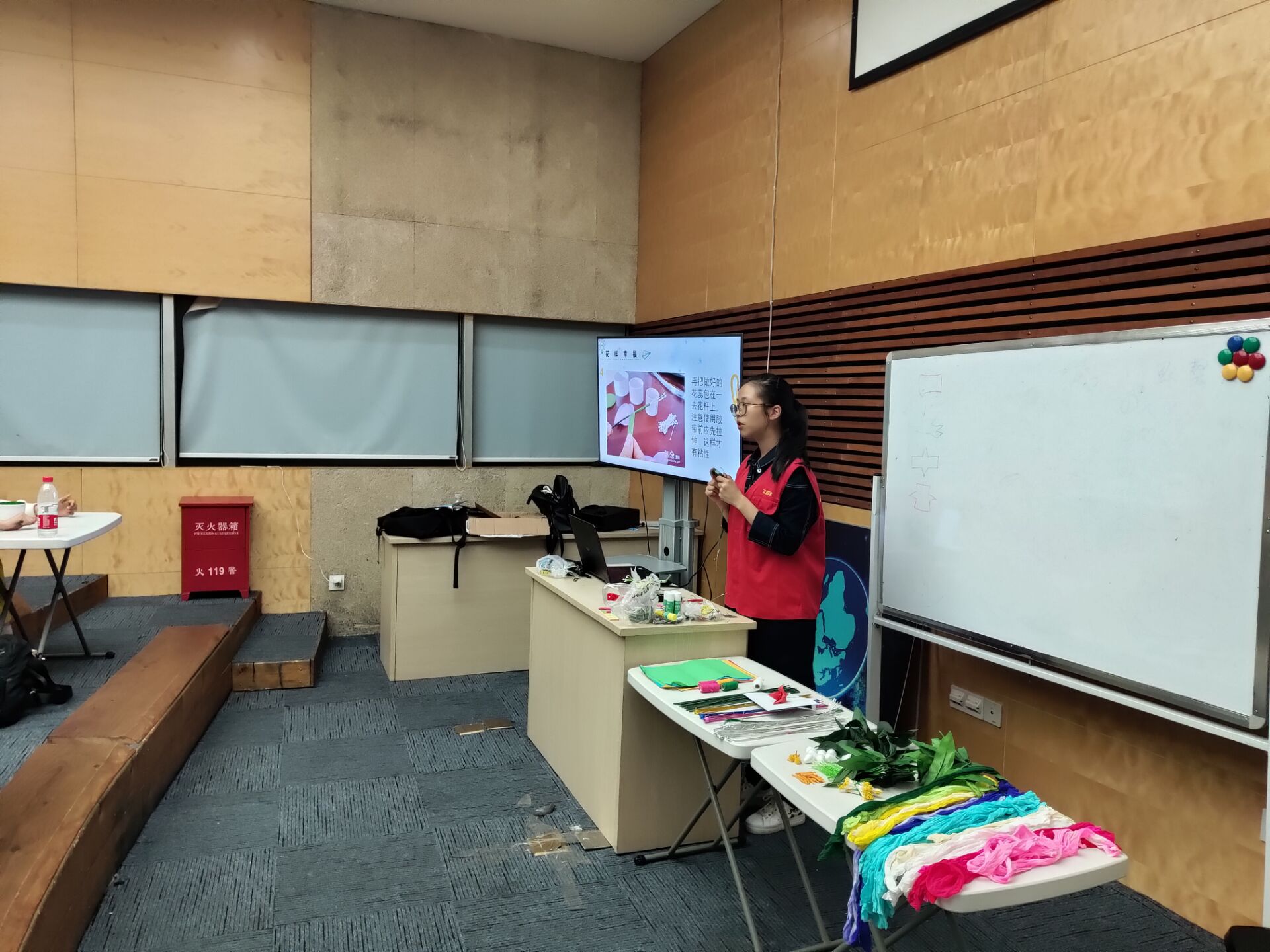 在手工制作花篮活动之前,B.D.服务社的干事和志愿者先在电子屏幕上播放科普视频,以便于更好地为接下来活动的开展做铺垫。他们通过动画的形式让小朋友更加容易简便地了解到自然界的植物。下午14:00,活动正式开始。首先,解说队的志愿者为大家详细地讲解了自然界中花的形态结构,教会小朋友们怎么识别花的种类,让小朋友去发现花朵的美丽、自然的美好;之后,志愿者们大致给小朋友们讲解了一下手工花的制作过程,为的是留给小朋友更多自我发挥的空间,同时,志愿者在讲解过程中也加入了提问环节,为回答的小朋友准备了小礼品,让他们在踊跃的回答过程中既收获了礼物又学到了知识。