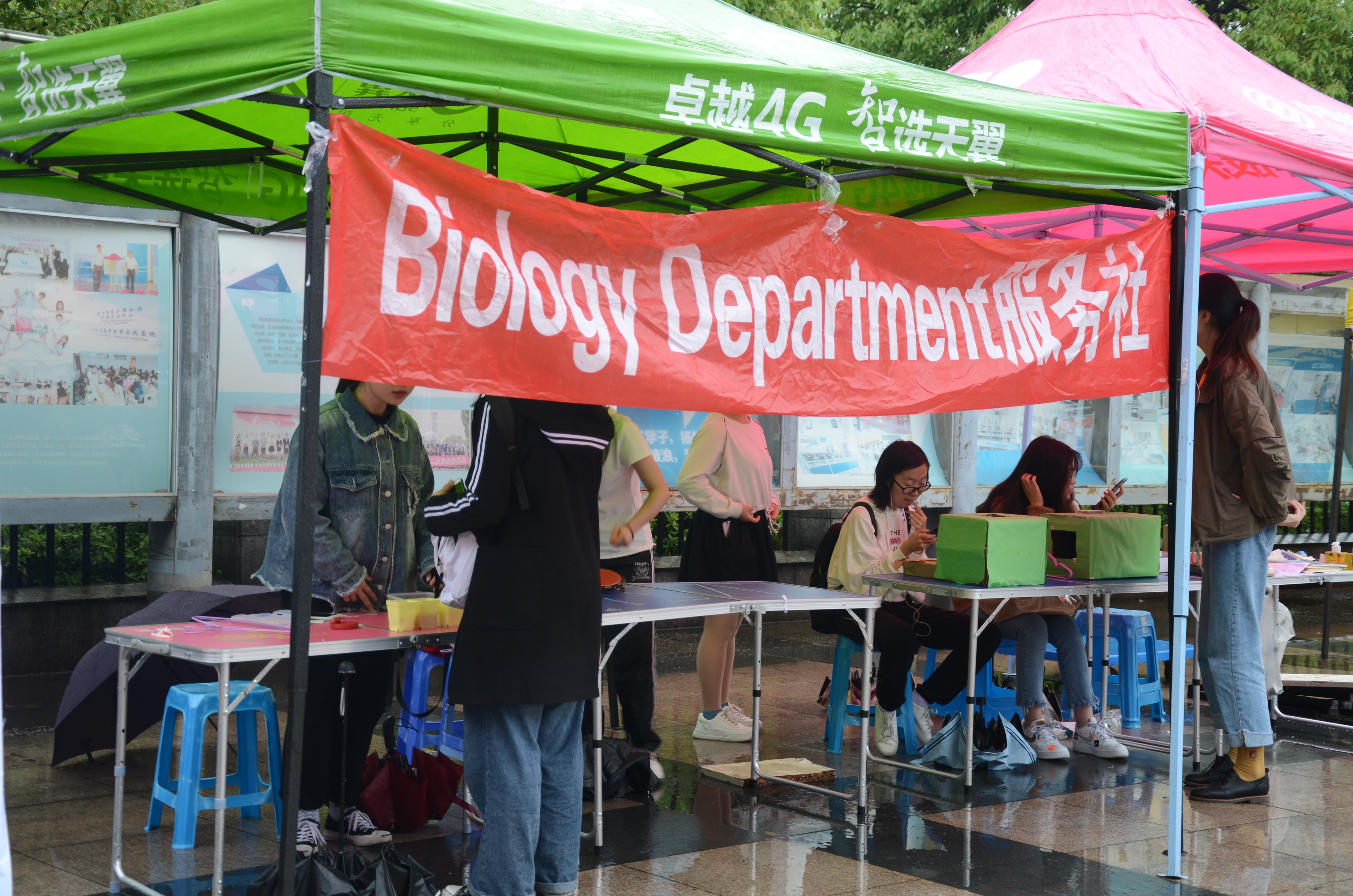 中午12:00左右,二期食堂广场外已搭建好帐篷,社团成员积极招揽来往学生,此次活动同学们只有顺利得到社团的“盖章”才有机会获得丰厚礼品。绿之翼环保协会的环工站活动需要同学们通过将模拟垃圾放入正确的分类垃圾桶方可盖章。B.D.服务社食安站活动的要求是摸物识豆,参与者先用眼观察并触摸每一种不同的放在盘子内的豆子,通过豆子旁标注,了解豆子的品种。30秒后蒙住参赛者眼睛,每位参赛者有五次从盒子里取豆子的机会,每次从封闭盒内拿出一个豆子通过用手触摸的方式猜出豆子的种类,猜对三次即为挑战成功,即可以在卡片上盖章。贝斯特乒乓球加油站的活动内容为稳中“球”胜,选手手持乒乓球拍,将乒乓球置于球拍上,走完规定路线,全程乒乓球不落地视为成功。“生命缘”青年志愿者协会则举行了知识竞答活动。野百合艺术团通过“我爱记歌词”来呼吁大家积极参与。社团间的游戏互相串联,参与的学生在五个活动中选取四个通过则可以有最终的抽奖获取奖品的机会。虽然是雨天,但同学们参与的热情依旧很高,在游戏中体会着快乐,也增长着知识。