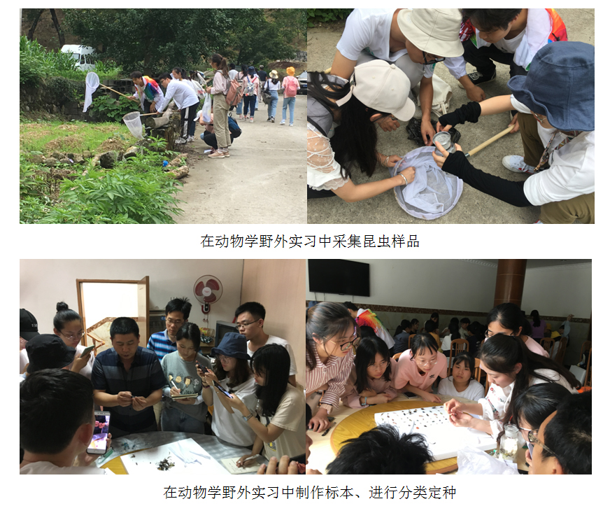 在动物学野外实习中,同学们观察了山、林地、溪沟环境中,以及农田环境里常见动物的种类、形态及分布规律,如昆虫、鸟类、小型兽类、两栖爬行类,鱼类、螺类等等,同时观察其生境特点;学会了动物尤其是昆虫类的采集、麻醉等标本制作方法,结合分类检索表和所学理论知识,进一步辨识和明晰了所制作标本的动物种类,初步熟悉了动物学野外实习工作的基本过程。在教师带领下,全体同学还在回程中参观了杭州动物园,认知和掌握了园区内各种高等哺乳动物的基本特征和生理习性。