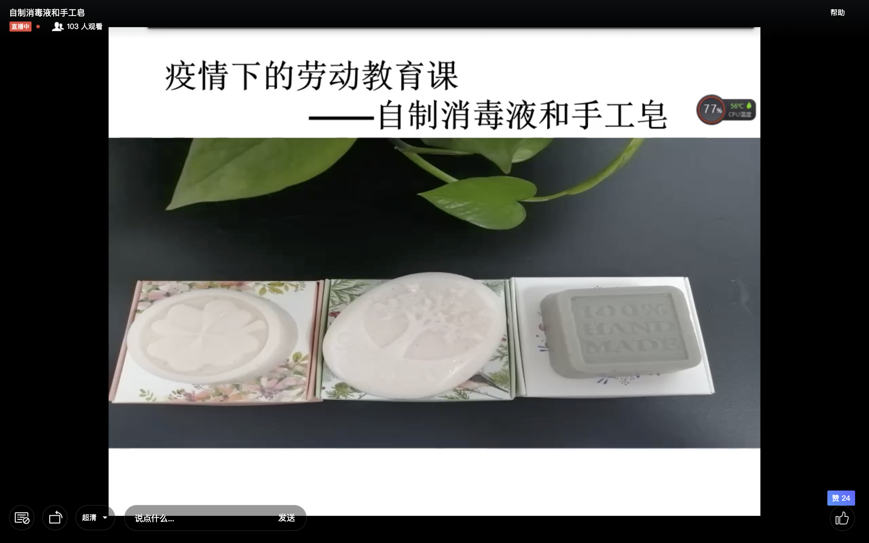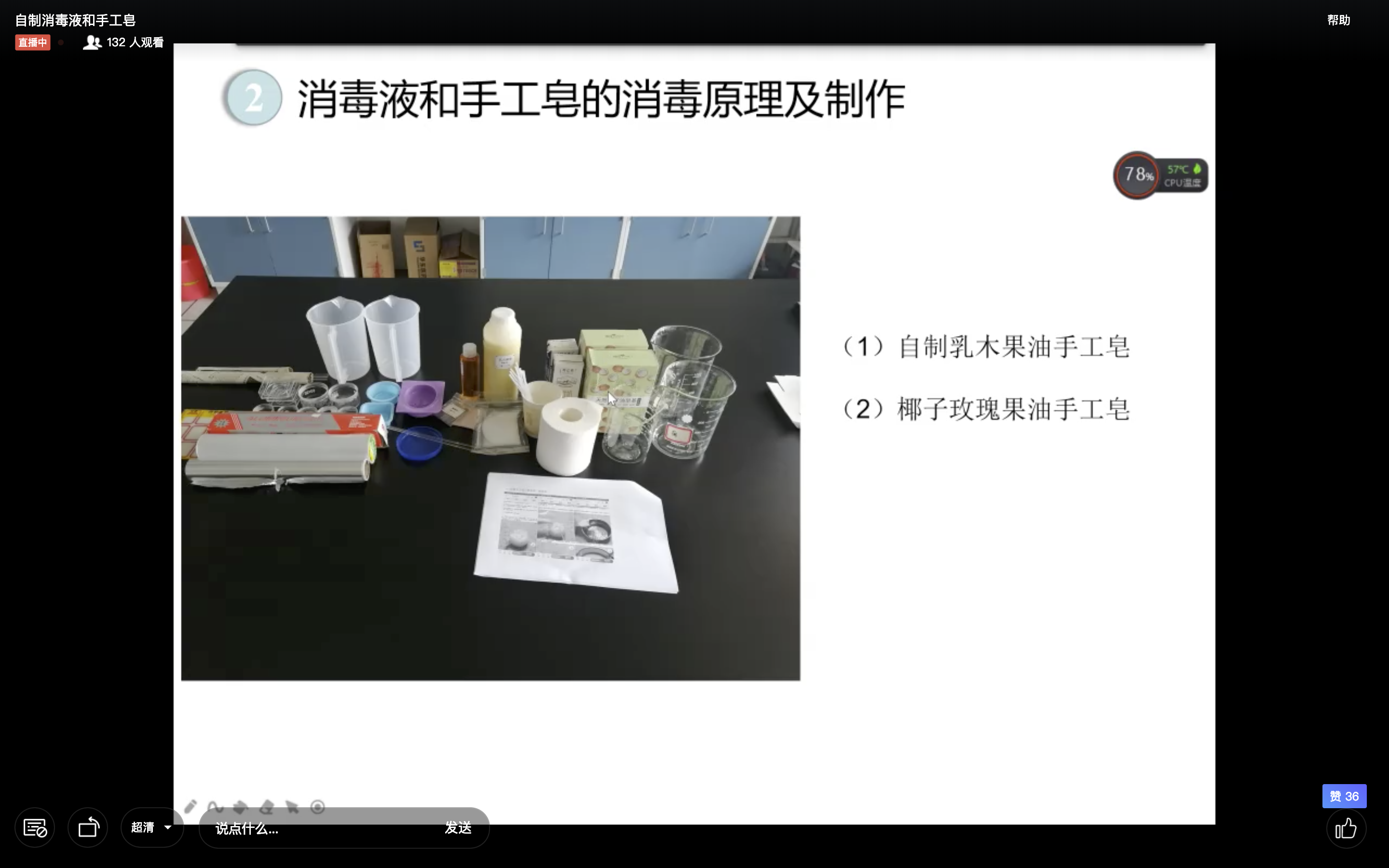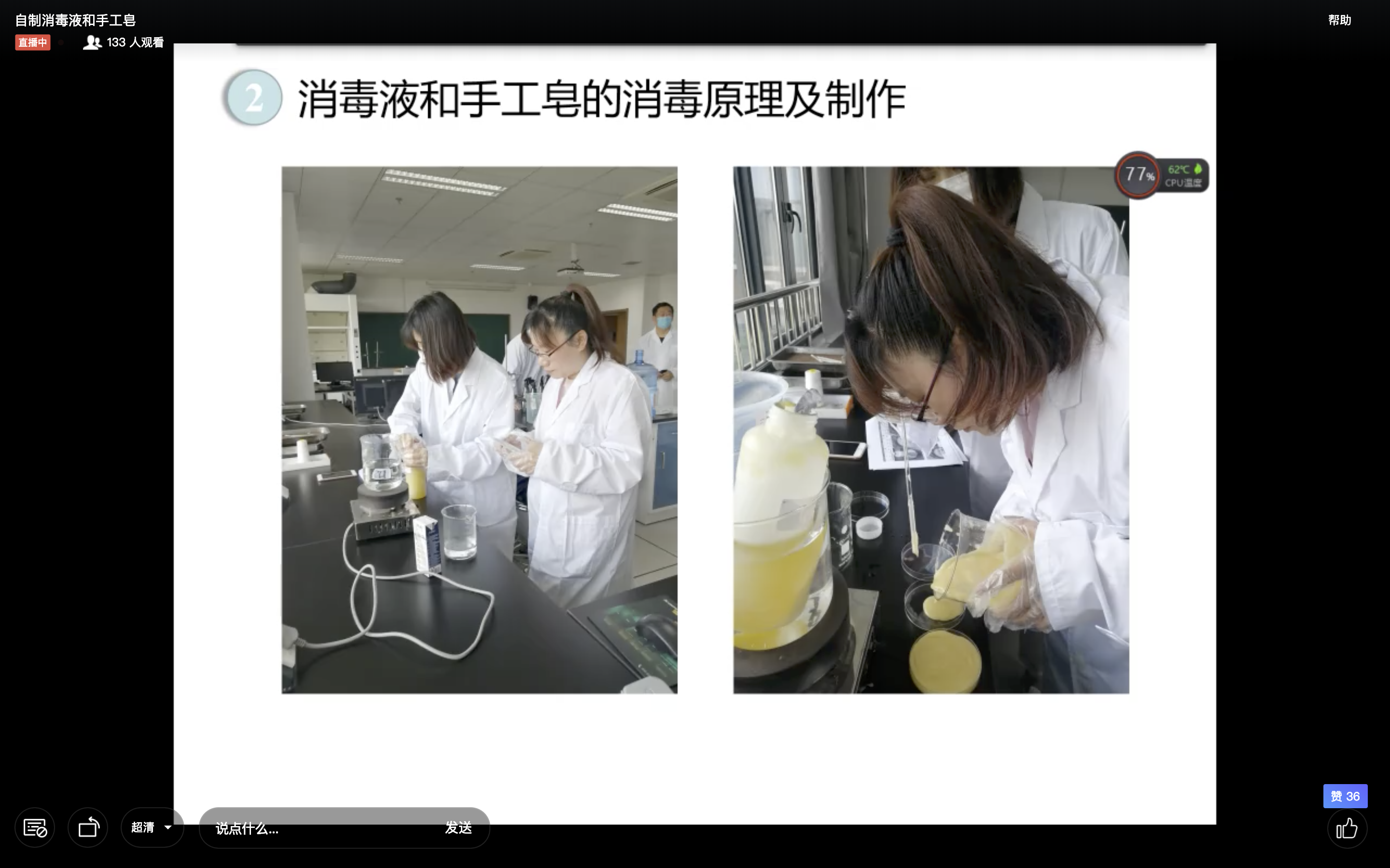 在提高国产a片 学子劳动技能知识的同时并兼顾疫情防疫的需求,5月27日18:30,国产a片 邀请到了实验中心办王娇娇老师在线上以直播形式,面向大一到大三生物技术专业的同学开展关于消毒液及手工皂制作的劳动教育讲座。