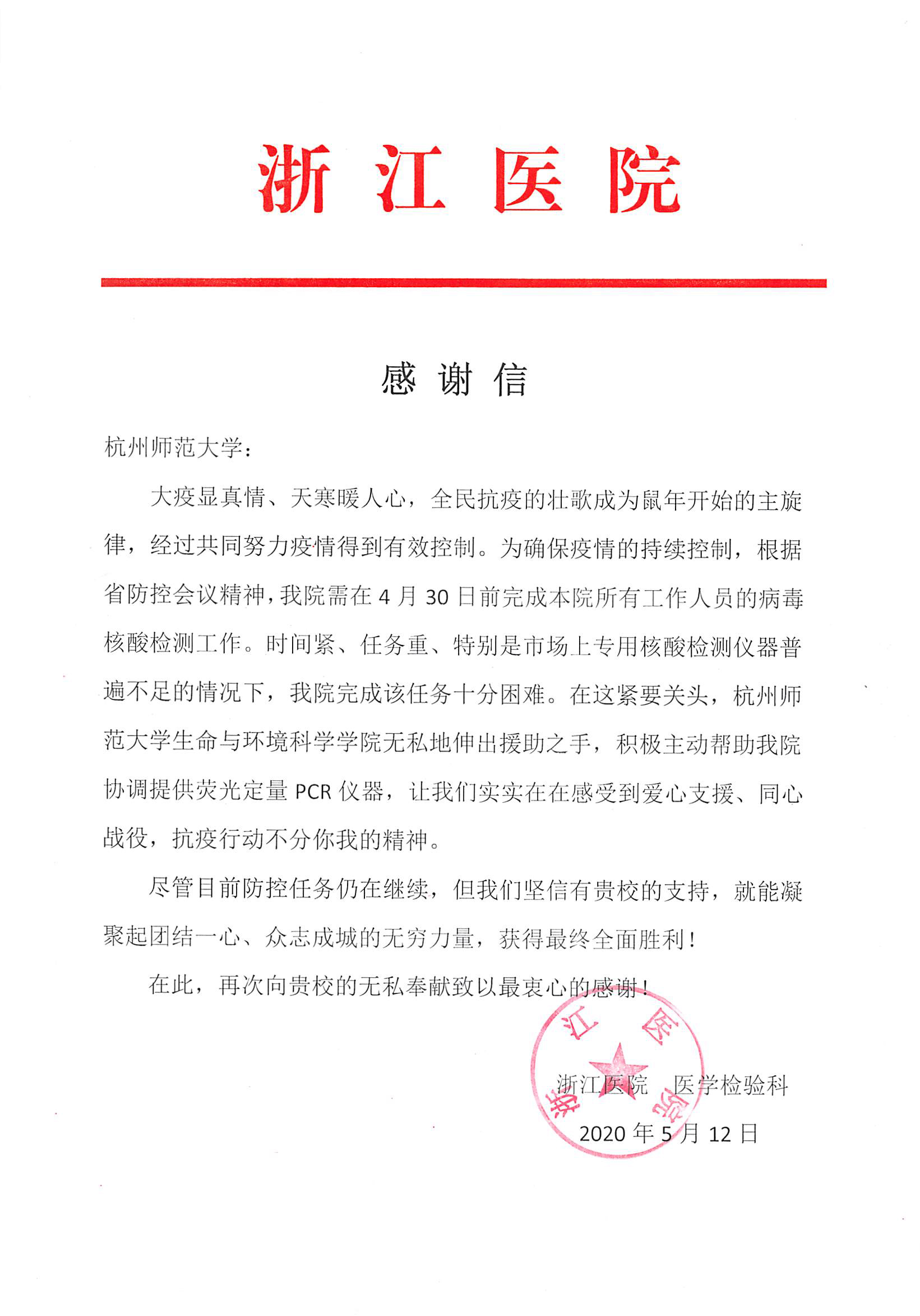 大疫面前见真情 爱心善举暖心田。浙江医院在面临专业检测仪器不足的情况下需在规定时间内完成院内所有工作人员的病毒核酸检测工作,在这紧要关头,国产a片 无私伸出援助之手,积极主动为浙江医院提供荧光定量PCR仪器,并在学院李艳老师的使用仪器指导下让浙江医院顺利完成检测工作。事后,浙江医院特意写了感谢信来表达对我校国产a片 爱心支援的衷心感谢。
