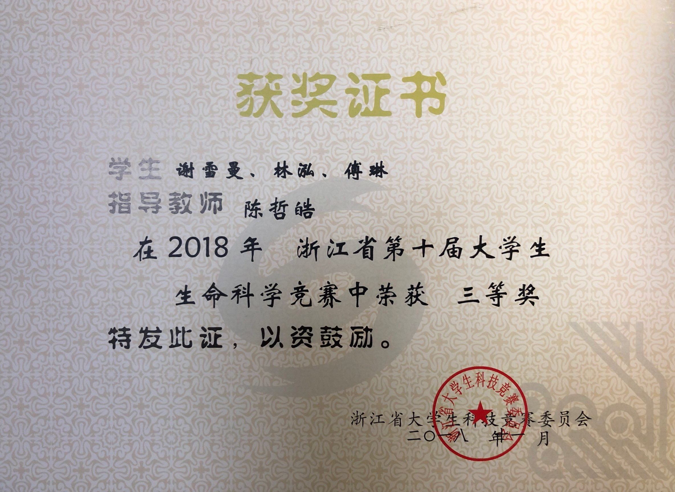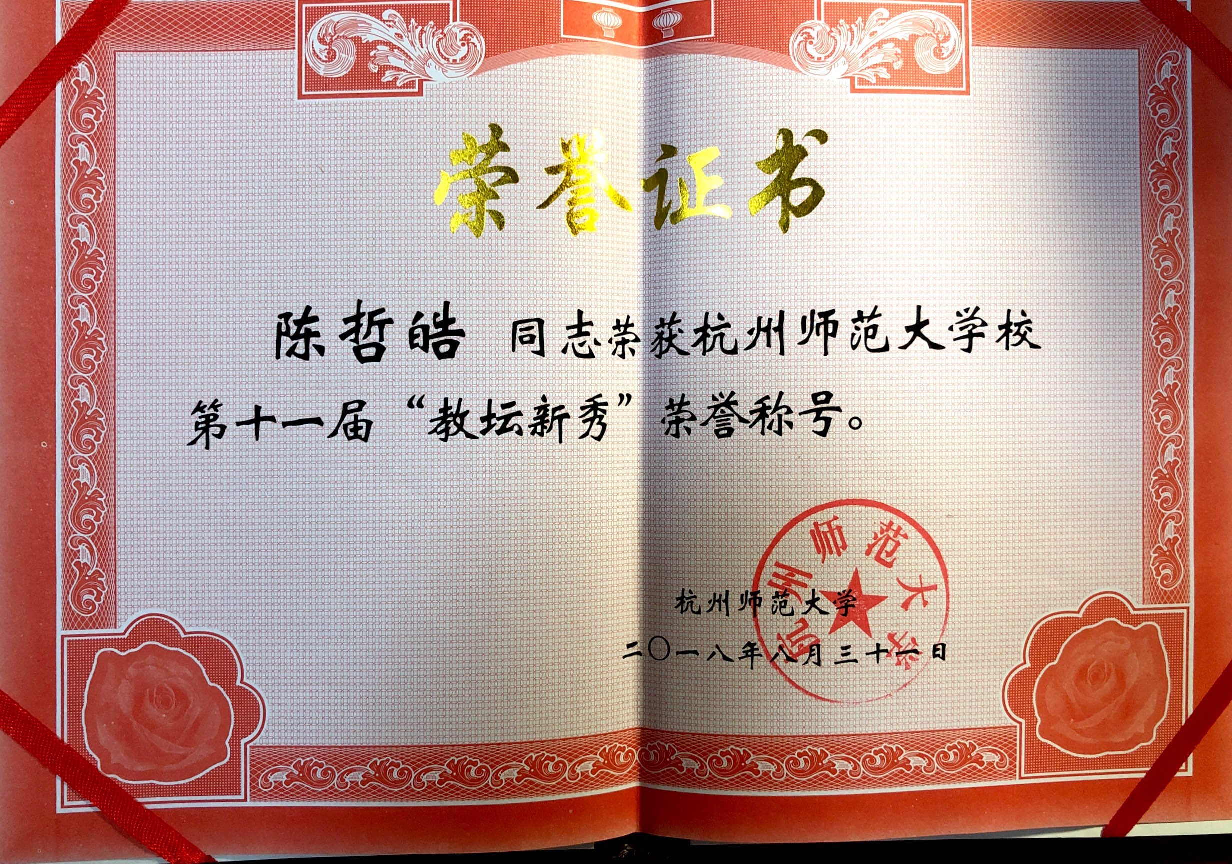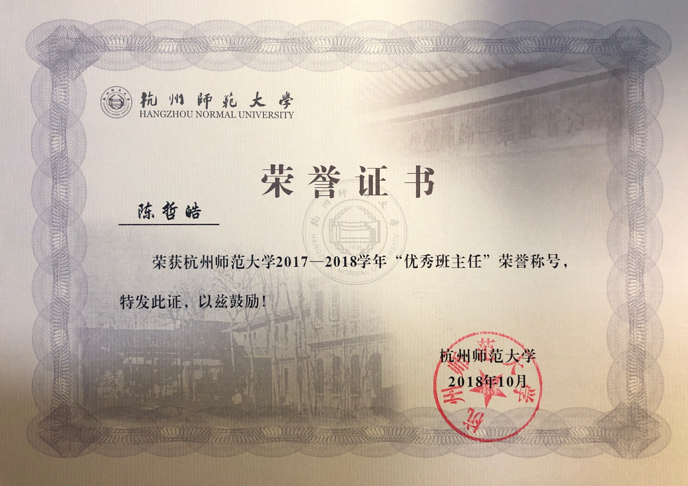 陈老师在当班主任期间连续三次获得优秀班主任称号,带队实习时被评为优秀实习指导老师。去年生命与环境科学学院推选陈哲皓老师评选校最喜爱的老师,同学们都积极踊跃地为陈老师投票。同学们也都很喜欢陈老师的课,因此他的课程被评为了校最喜欢的课程。