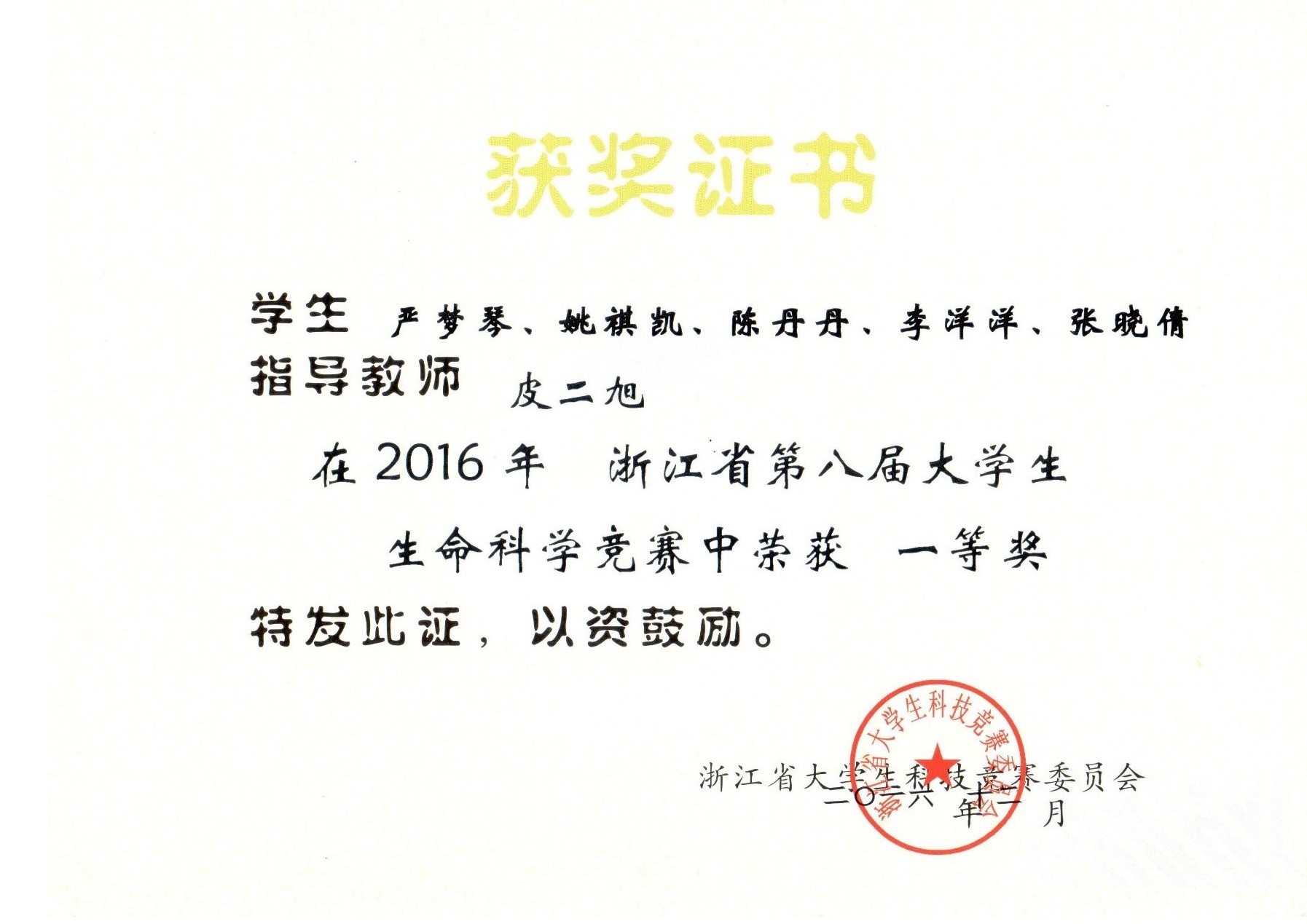皮老师精心备课,几乎每年都会调整一些PPT的内容,每周的周末都会记忆下周上课的知识点,课前仔细思考和打磨教学方案,在正式上课前根据实际情况调整一些讲课的内容,力求自己的教学能力保持在最好的状态。正是皮二旭老师这种严谨、尽职的态度,他指导的学生多次获奖,而他本人也以第一作者或通讯作者共计发表SCI论文20余篇。皮老师连续四年指导学生参加浙江省新苗人才计划项目,培养学生团队多次获得全国大学生生命科学竞赛全国二等奖、三等奖,浙江省生命科学竞赛一等奖、二等奖,浙江省“挑战杯”大学生课外学术科技作品竞赛二等奖,在2019-2020年指导学生参加国家大学生创新创业项目并结题。