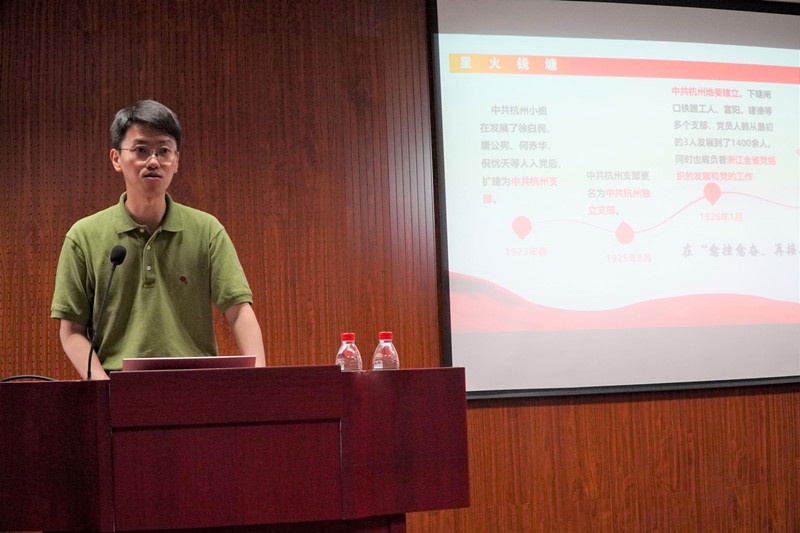 首先,医学部团委书记杨迪老师为同学们讲述了党员徐梅坤的故事。杨迪老师从徐梅坤在杭州开展建党工作,建立中共杭州小组讲到了他在“四一二”反革命政变后被捕处刑,后因病重被保释出狱,恢复党员身份。我们能通过徐梅坤同志的故事看到中国共产党建立之初奋斗的艰辛与困难重重,也能看到共产党员们对党的坚定信念和对社会主义事业满腔热忱。