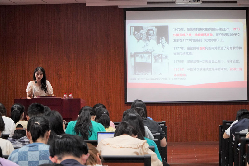 最后,我校优秀学生宣讲团成员生科172班张蓝天学姐向同学们讲述了童第周的科研贡献,并分享了自己在科技研究方面的辛苦历程。她鼓励同学们要在繁忙的学业之中找到自己学业方面的发展方向,并用自己的研究成就告诉同学们要不畏研究过程之中的艰险,勇敢向前,做到不负青春!