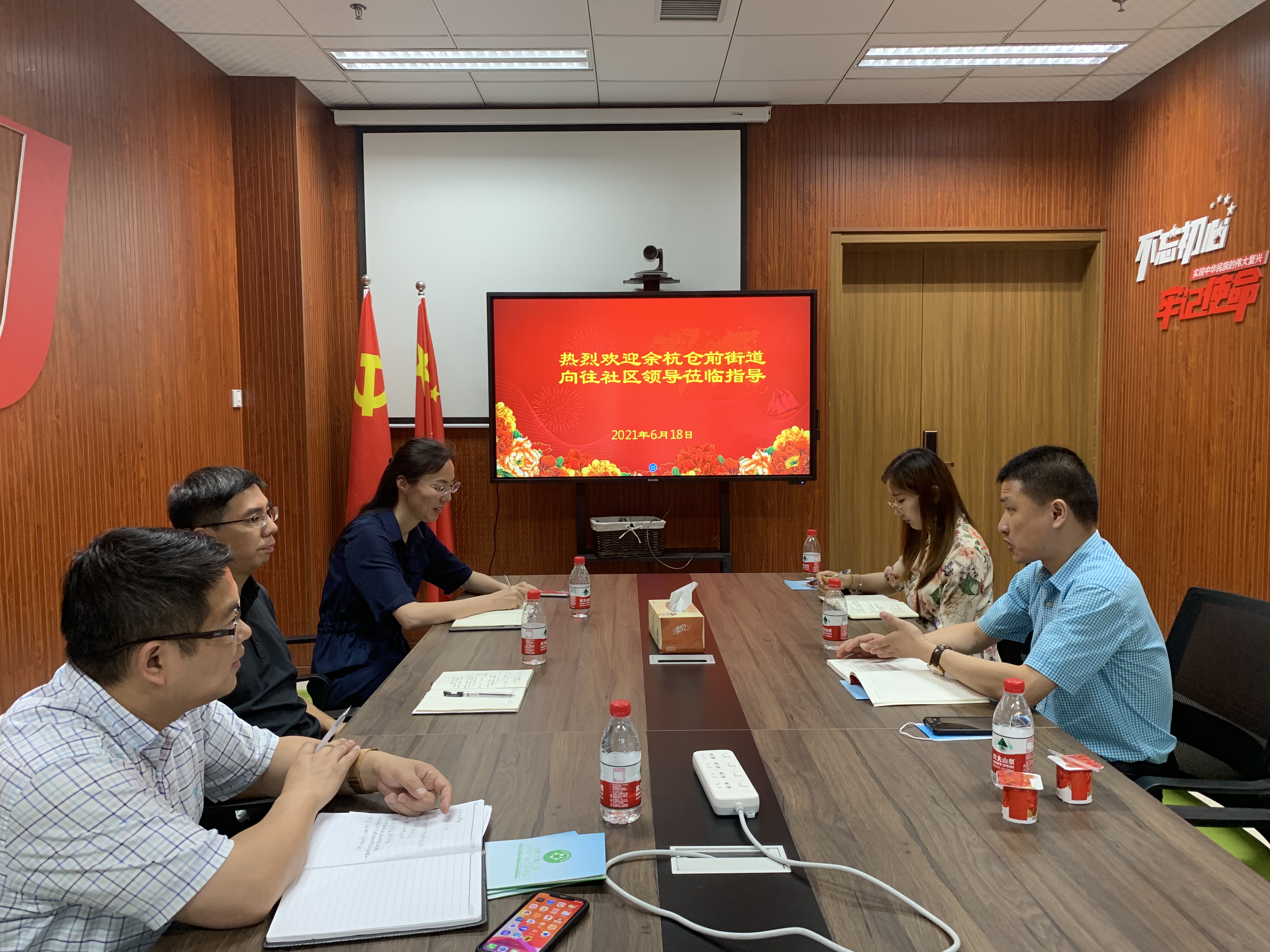 618日,余杭区仓前街道向往社区领导莅临国产a片 学院党委书记张立明、党委副书记余洁和办公室主任、组织员参与交流。