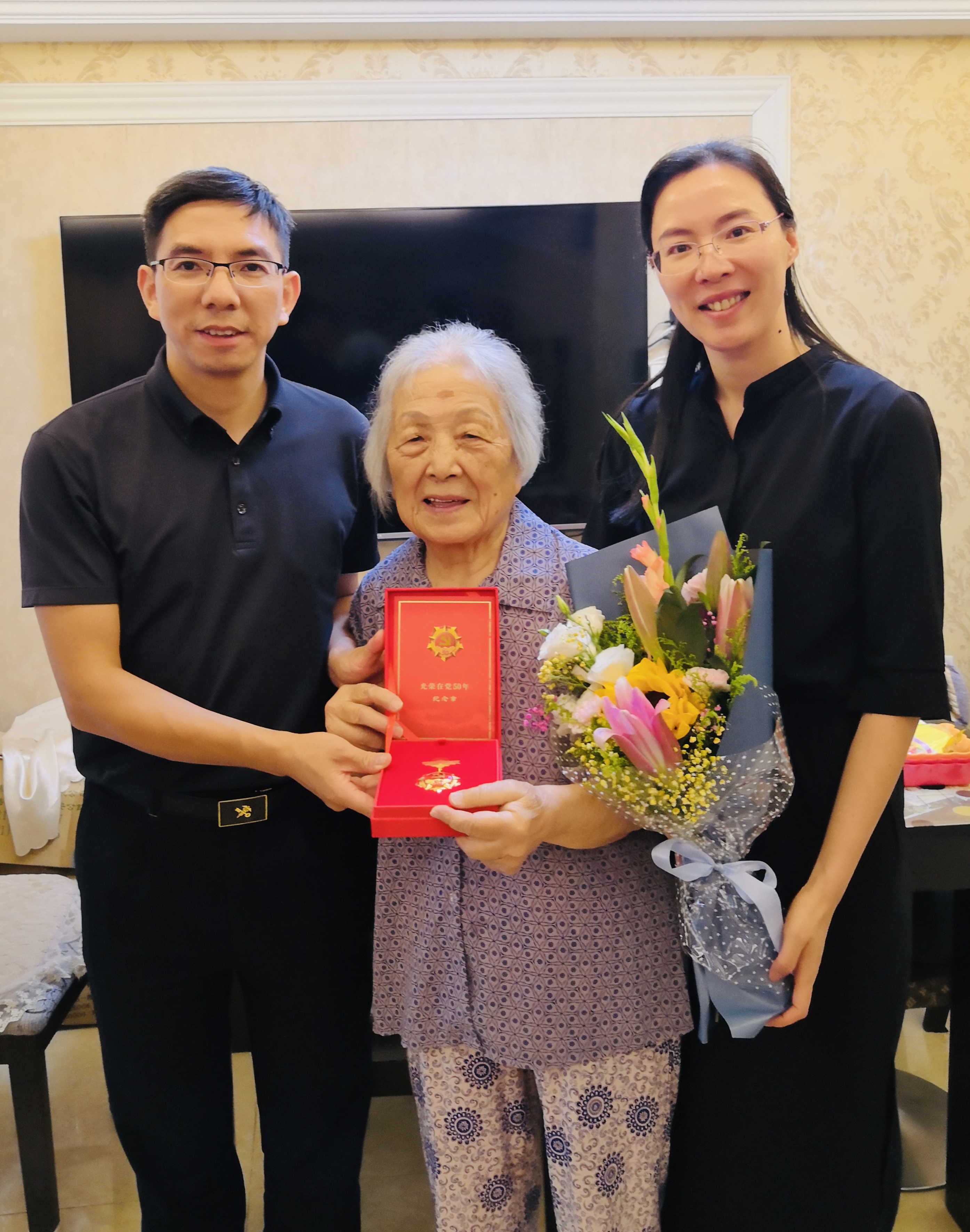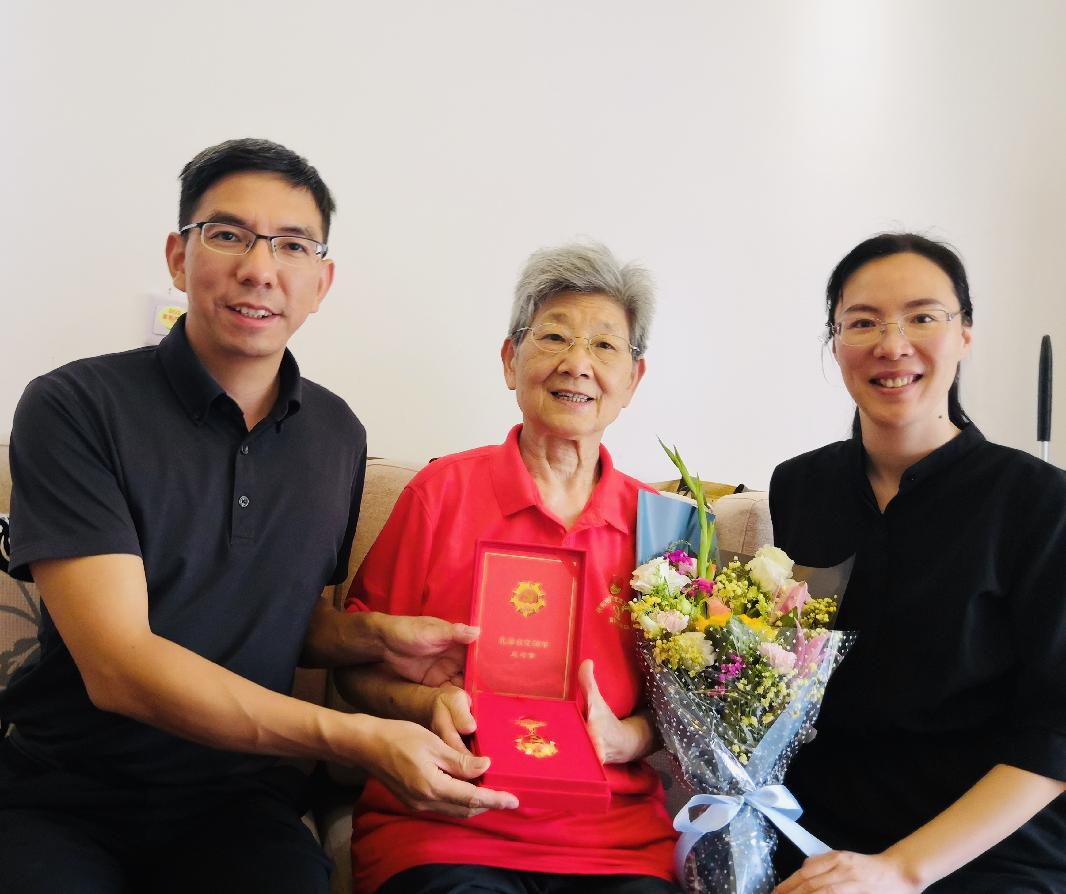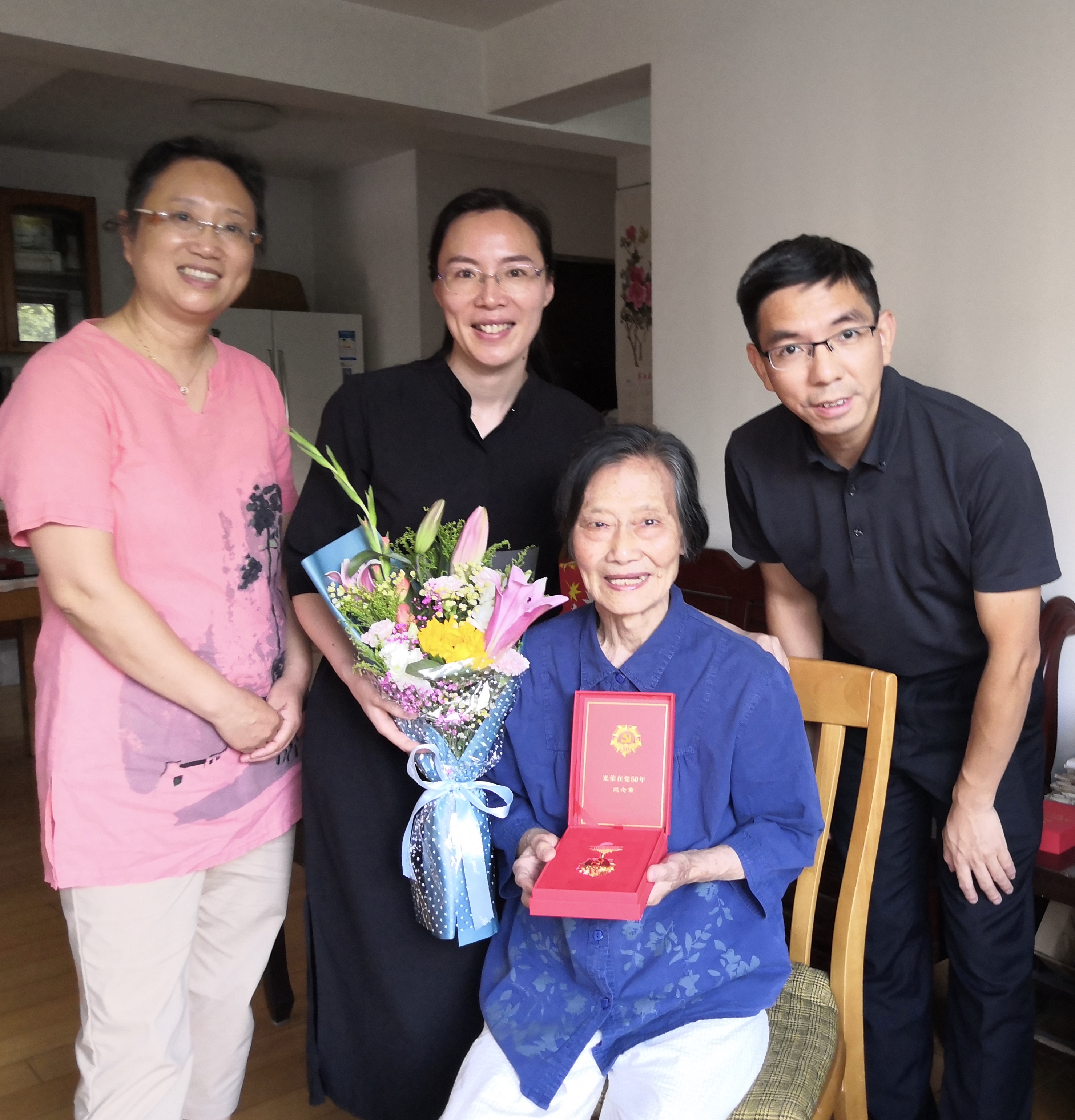 院领导们先后来到罗紫娟、曾祥幼、江雪寻、周之瑜四位老党员住处,为他们颁发“光荣在党50年”纪念章,送上鲜花和慰问品,同他们促膝交谈,详细询问和了解他们的家庭生活和健康状况,聆听老党员们讲述年轻时入党时的经历、克服困难坚持求学、教学科研育人、投身学校学院建设等奋斗故事。