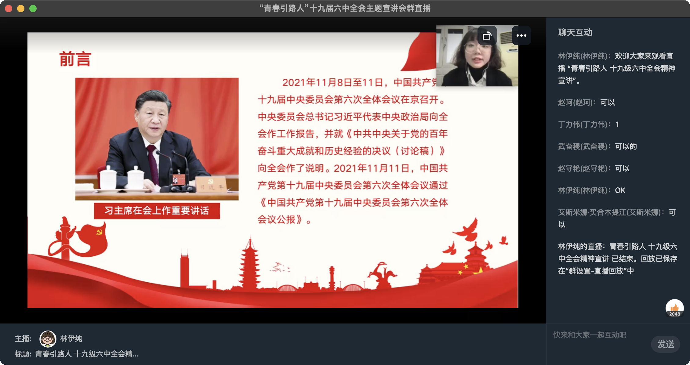 为引导广大学生深入学习党的十九届六中全会精神,202215日下午,生命与环境科学学院面向全体2021本科生,特邀请人文学院林伊纯老师开展线上主题宣讲活动,活动由辅导员孙天一老师主持