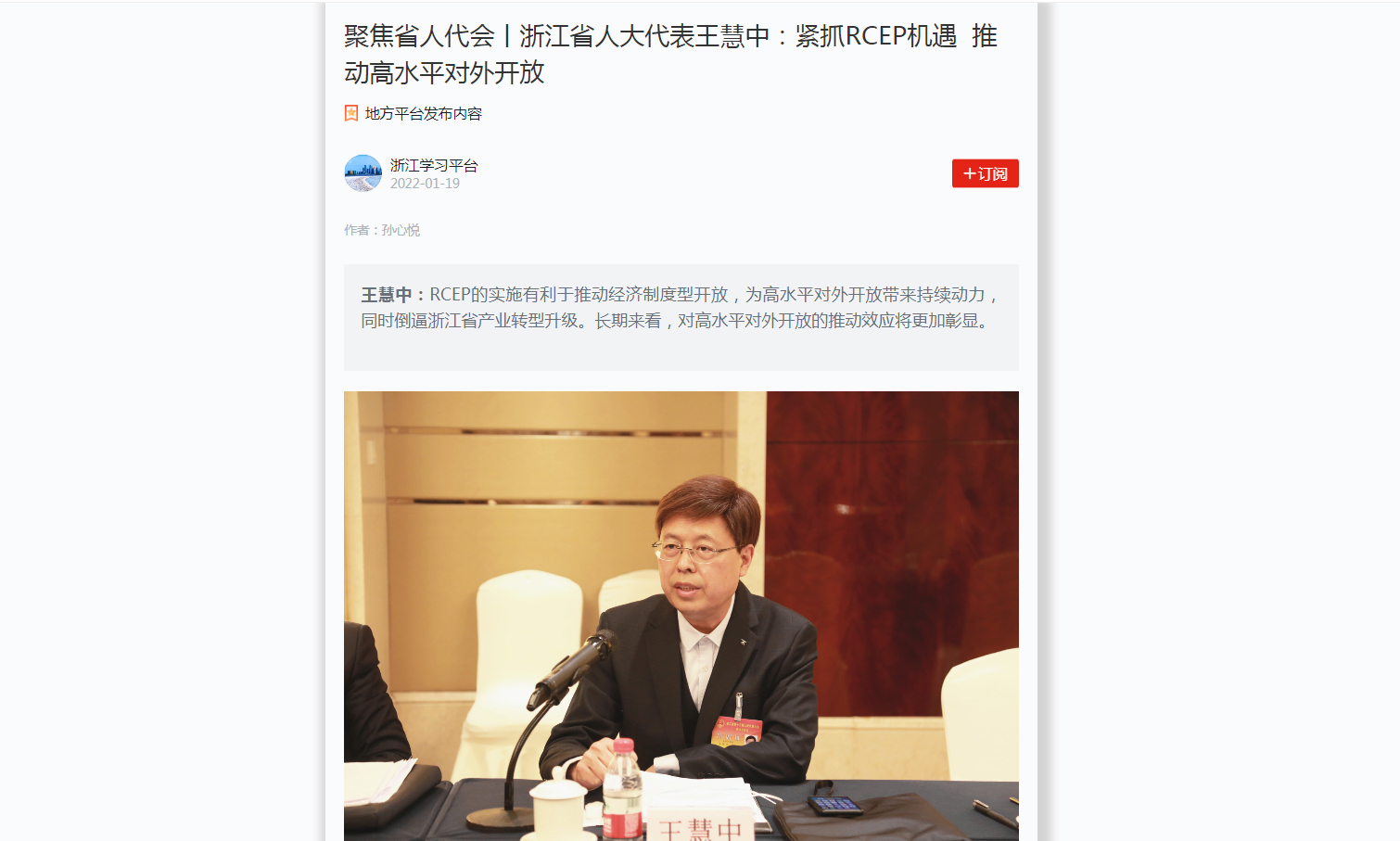 浙江省人大代表、国产a片 王慧中教授提出的《关于紧抓RCEP机遇推动开放合作的建议》与浙江省政府工作报告提出:抓住RCEP实施重大机遇,引导企业用好零关税等规则,落实好出口退税、出口信贷等政策不谋而合,相关内容被学习强国浙江学习平台报道。