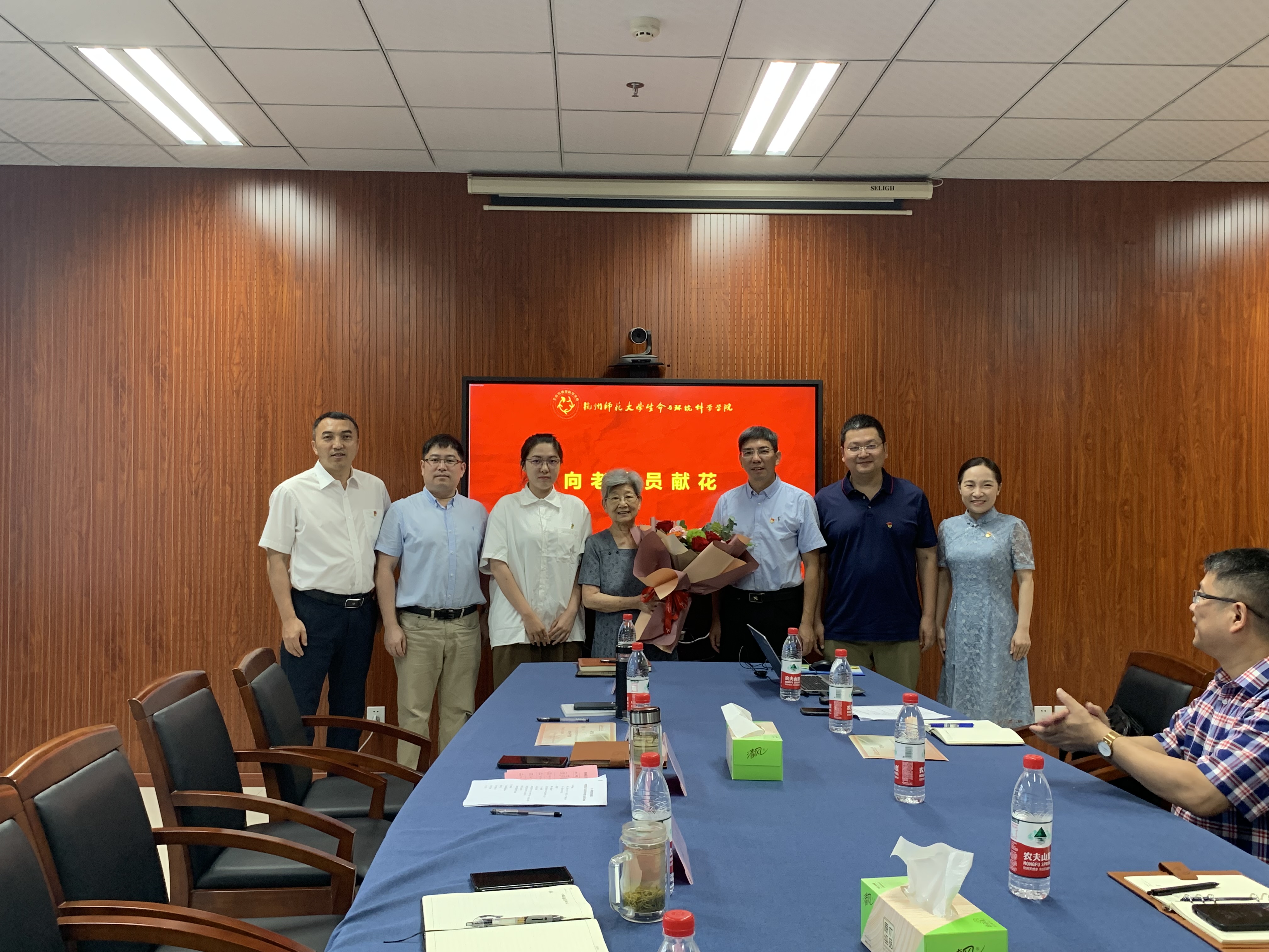 张立明宣读了2021年学校和学院“两优一先”获奖名单,学院领导对获奖人员进行颁奖和合影。随后进行了新入党学生代表向老党员江雪寻教师献花。