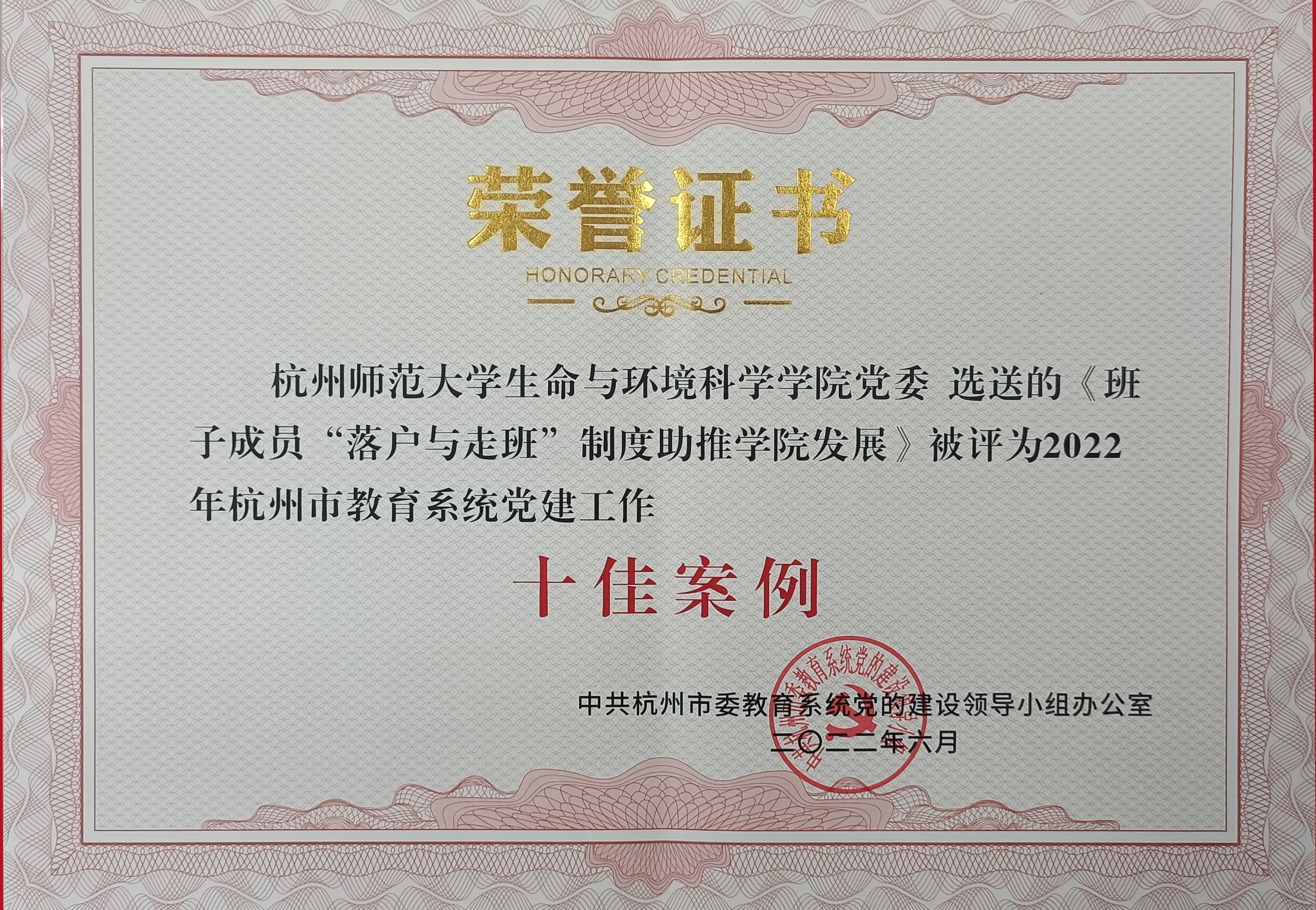 喜报-《班子成员“落户与走班”制度助推学院发展》被评为2022年度杭州市教育系统党建工作十佳案例