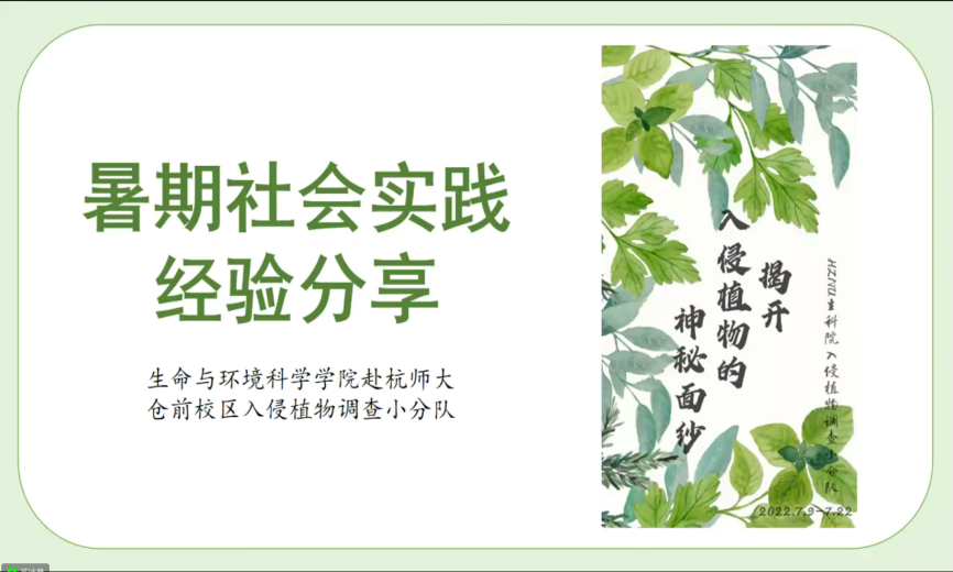 生命与环境科学学院赴杭师大仓前校区入侵植物调查小分队团队负责人裘诗晨同学从组员和组长两个身份角度来谈论社会实践的参与感和对应工作,讲述了自己进行社会实践遇到的困难及注意点,展开了自己的见解。