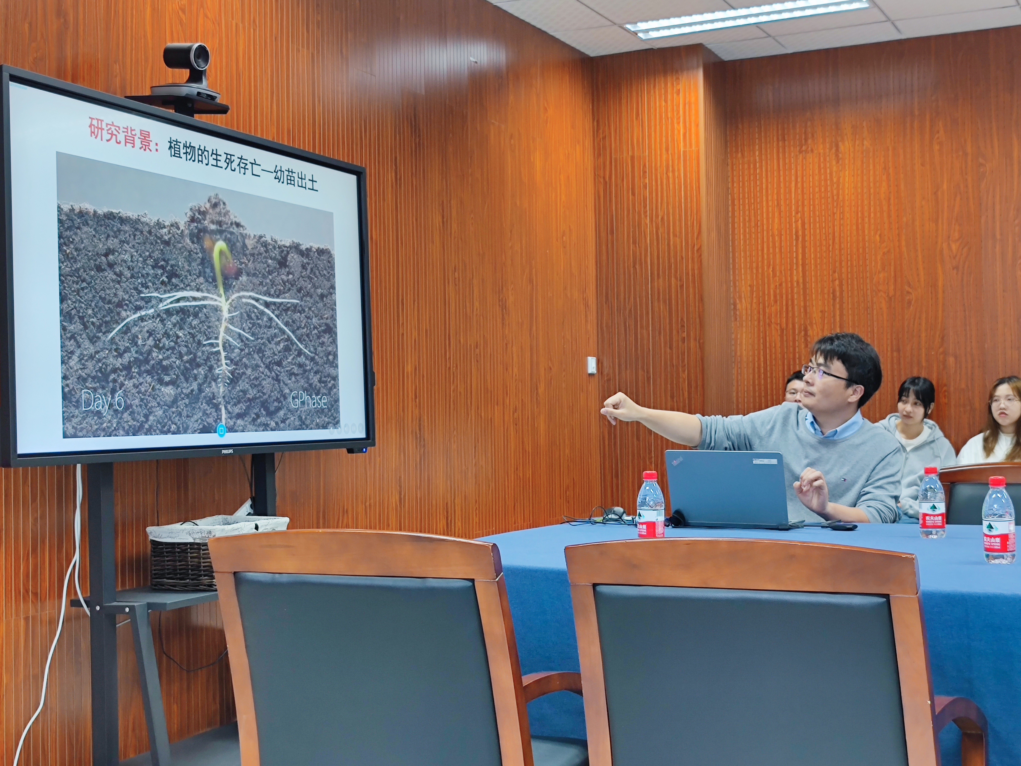 首先,钟上威研究员做了题为《植物光温信号感知》的报告,他分别从机械压力触碰调控植物幼苗出土的分子机制,光敏色素蛋白B(phyB)通过光控可逆变构及温控液-液相分离实现植物对光温两种不同环境信号的共感知,以及光调控phyB如何进入细胞核发挥功能的分子机制这三个方面详细介绍了他们团队近年在环境信号分子感知领域的重要研究进展。