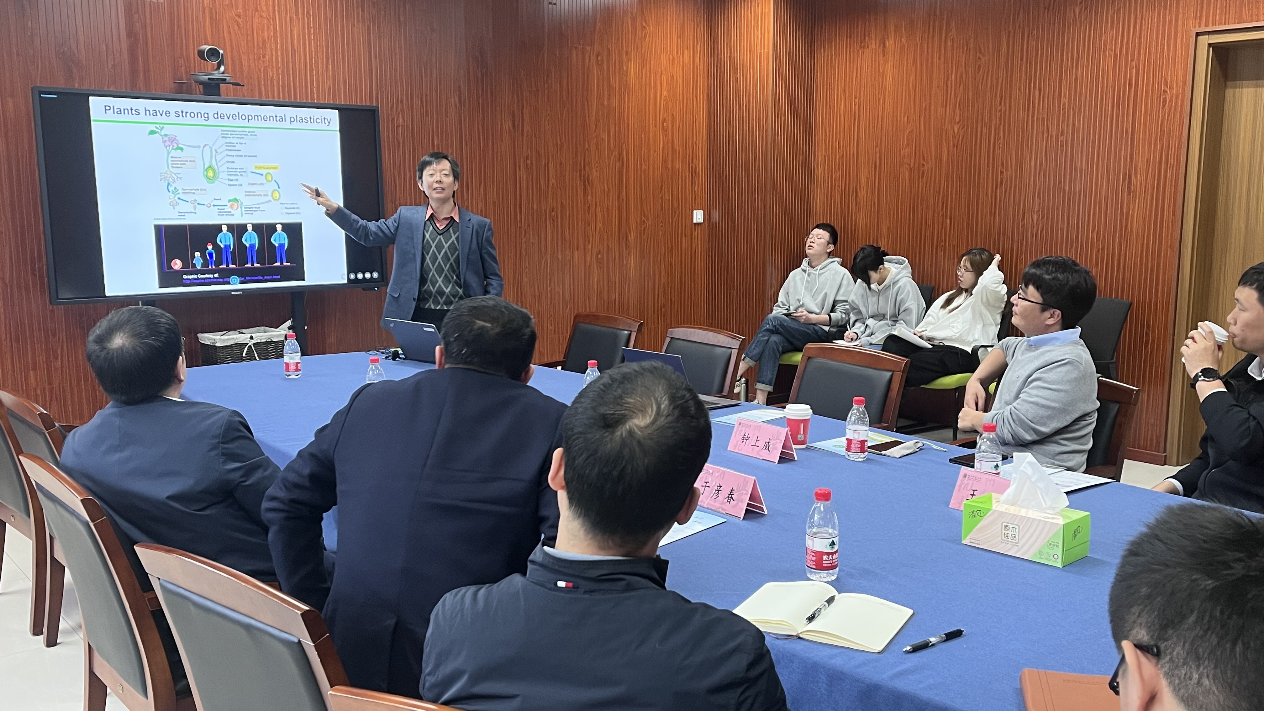 随后,丁兆军教授做了题为《植物根的可塑性生长发育与逆境适应》的报告。他以植物发育具有很强的可塑性为切入口,分别介绍了其团队近几年研究根生长发育调控机制的重要发现,其中包括:转录因子NAC1能够与SCR/SHR-CYCD6;1模块整合调控根基本组织的成熟;MPK14-IAA33模块通过维持根尖的最佳生长素信号以调控根尖干细胞微环境稳态的分子机制,以及生长素协同ROS信号调控根尖干细胞稳态的分子机理等一系列重要成果。