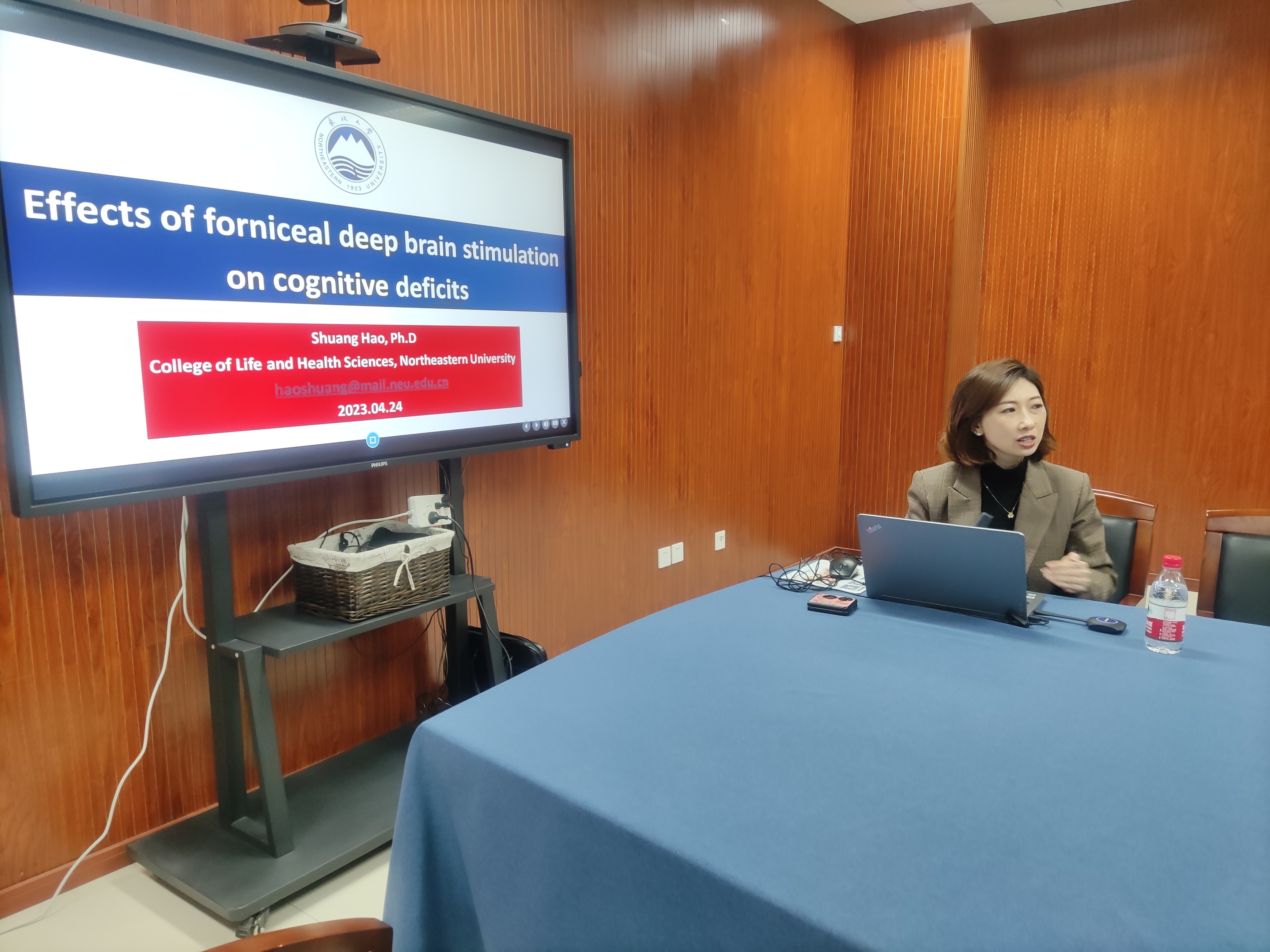 4月24日下午,国产a片 在慎园15-313会议室举行了2023年第14期生科撷英讲坛,东北大学“海外百人”青年特聘教授,国家级青年人才项目入选者,辽宁省“兴辽英才计划”青年拔尖人才郝爽教授,应邀来国产a片 为师生们做了题为“Effects of forniceal deep brain stimulation on cognitive deficits”的学术报告。讲座前,薛大伟院长和张立明书记与郝爽教授进行了座谈会,随后薛大伟院长主持了论坛,神经发育生物学方向老师和研究生积极参加。