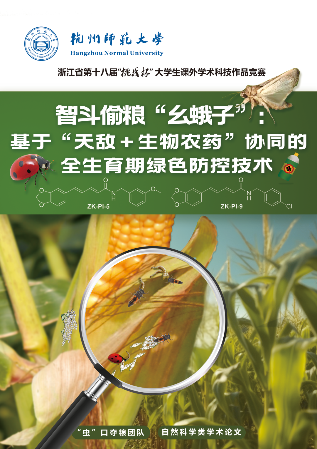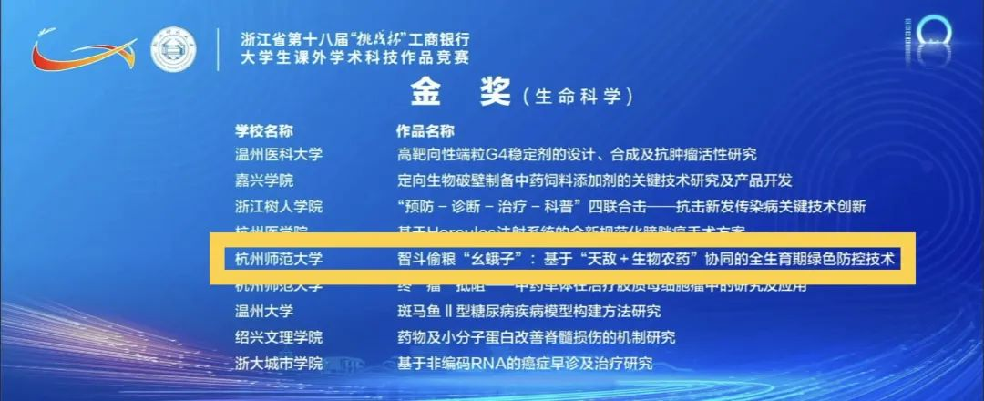 5月19日至21日,浙江省第十八届“挑战杯”大学生课外学术科技作品竞赛决赛在我校举行。经过集中答辩环节角逐,国产a片 报送的《智斗偷粮“幺蛾子”:基于“天敌+生物农药”协同的全生育期绿色防控技术》荣获金奖。