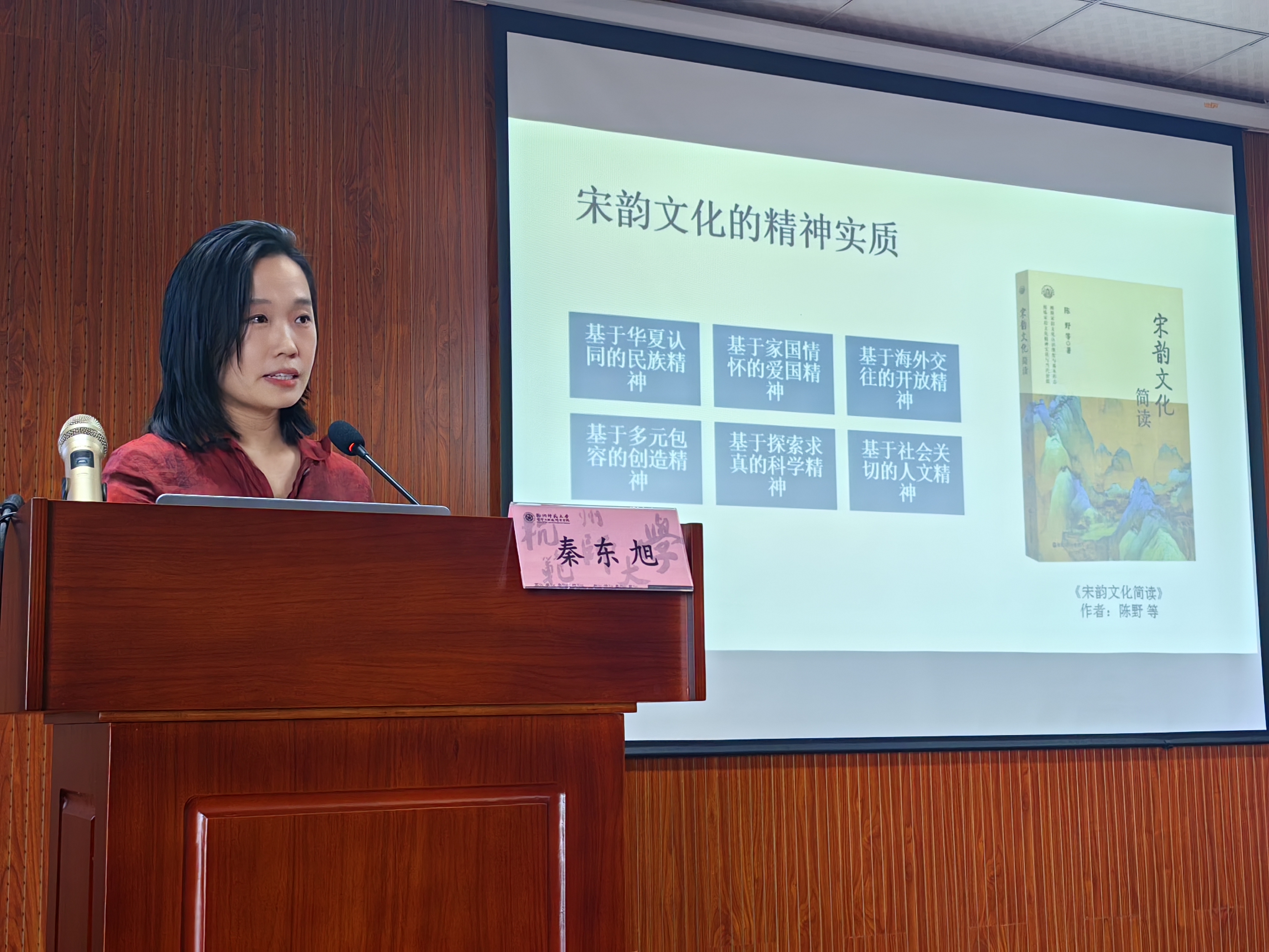 秦东旭博士介绍了关于宋韵文化的知识和特点,强调了它对于培养文化自信心和传承中华文化的重要性。同时还介绍了一些具体的实践案例,展示了宋韵文化在公共文化建设中的应用和价值。通过学习强调中国传统文化的重要性,尤其是宋韵文化对于广大师生文化自信和精神富有的影响。