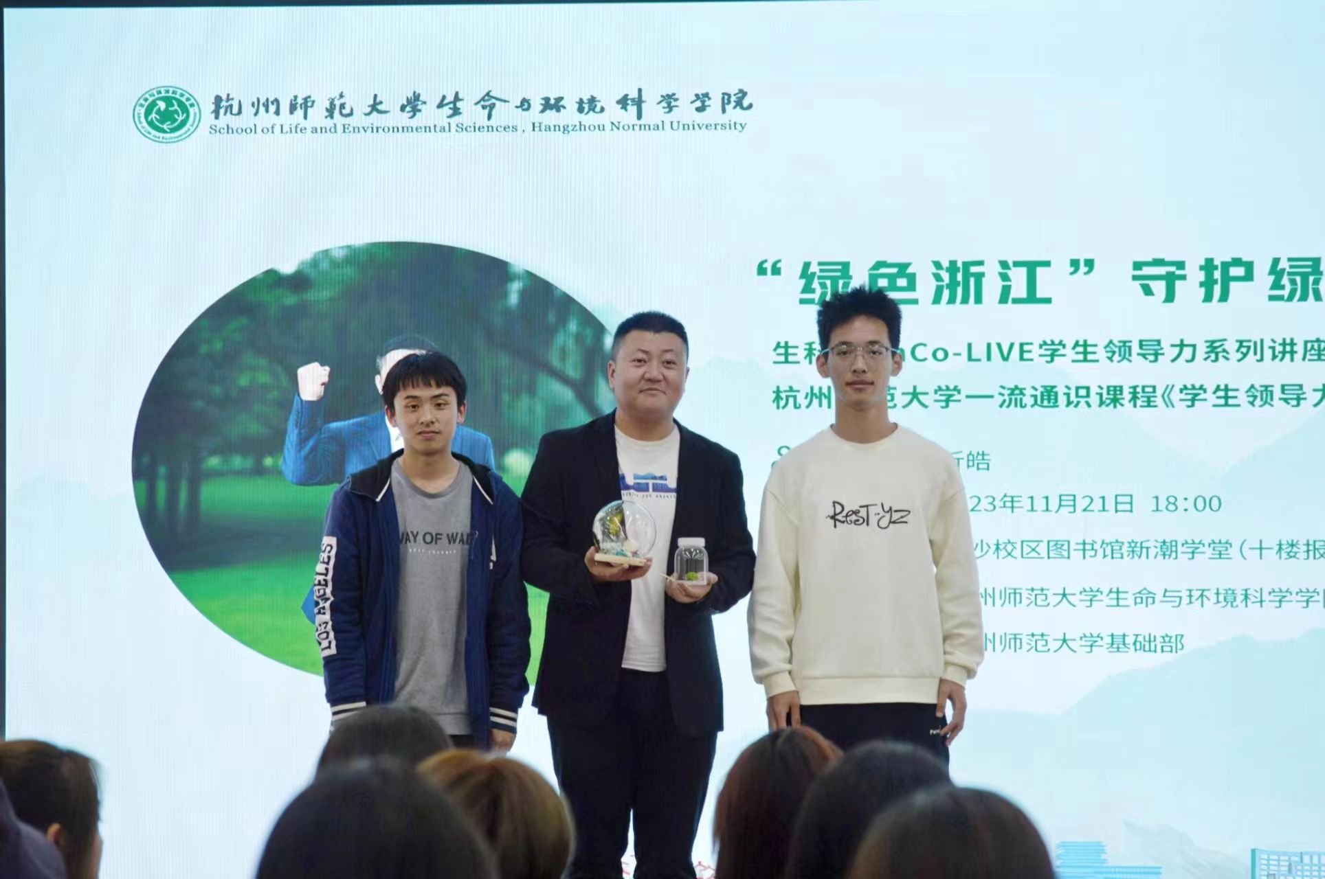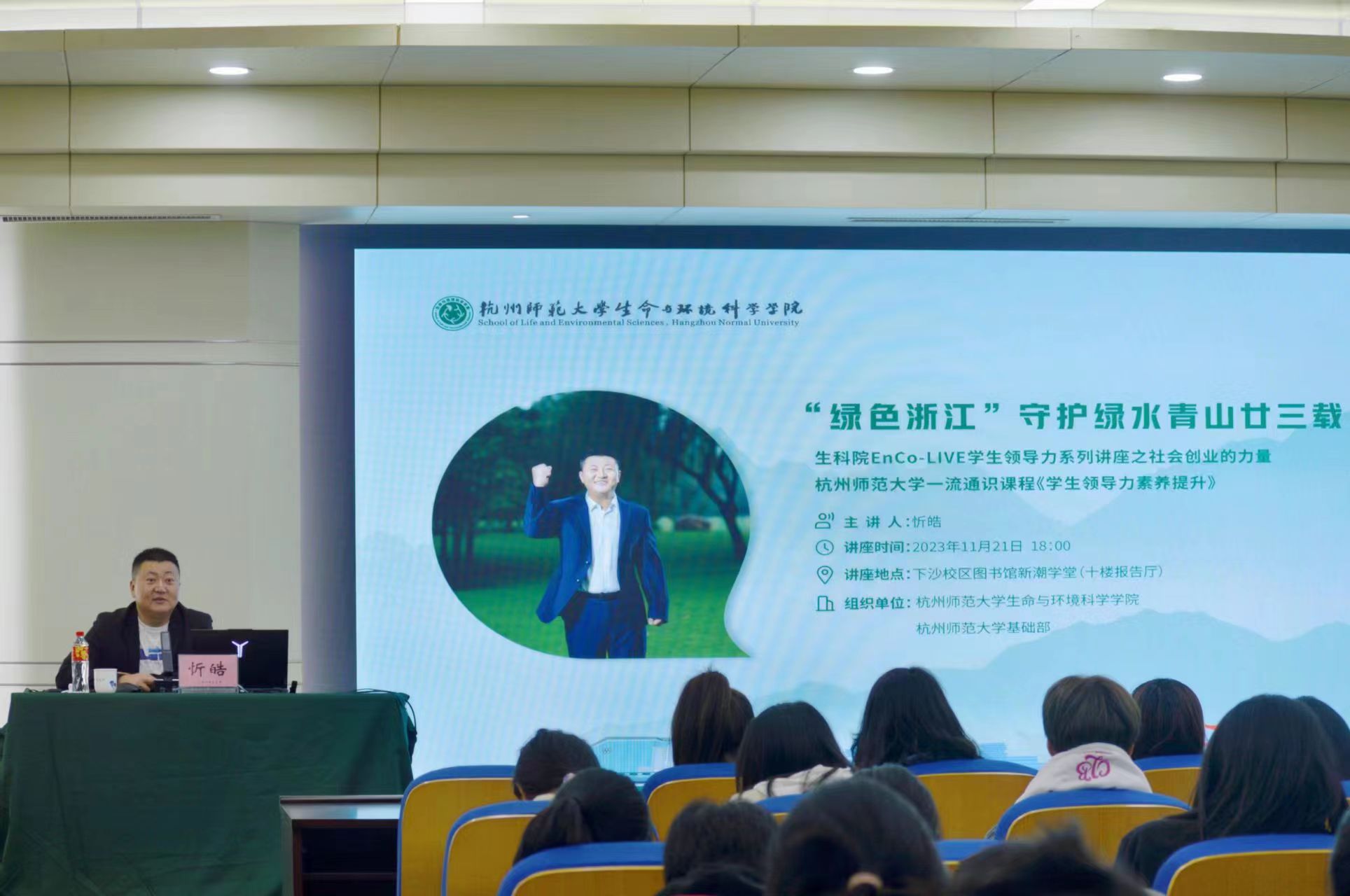 11月21日晚,生命与环境科学学院、基础部、公共管理学院联合举办EnCo-LIVE学生领导力系列讲座之社会创业的力量。浙江省科普联合会秘书长、“绿色浙江”联合创始人,社会创业者,生态文明理念传播者忻皓于下沙校区图书馆新潮学堂作“绿色浙江守护绿水青山甘三载”主题讲座。