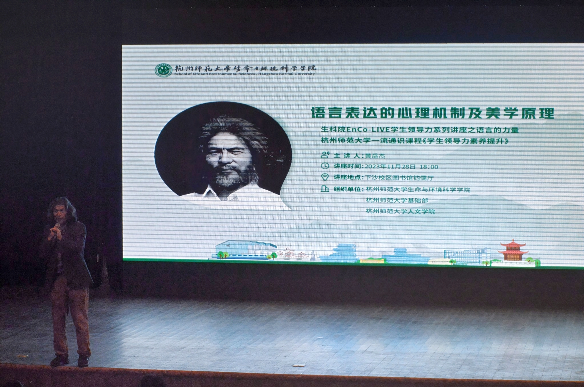 11月28日,生命与环境科学学院、基础部、人文学院联合举办EnCo-LIVE学生领导力系列专题讲座之语言的力量。中国戏剧家协会会员、杭州市戏剧家协会副主席、浙江省首届高校优秀教师、杭州市五一劳动奖章获得者、人文学院教授黄岳杰在下沙校区钧儒厅作“语言表达的心理机制及美学原理”主题讲座。