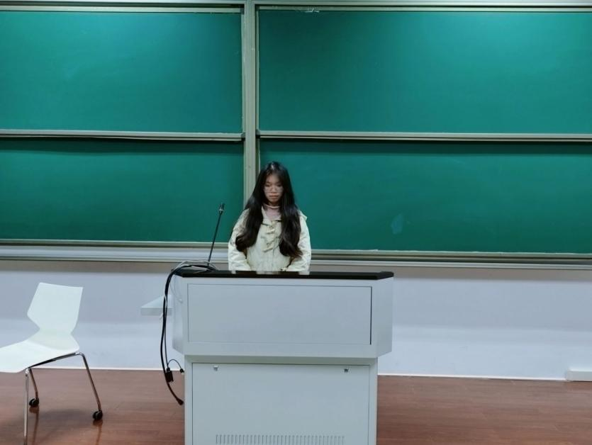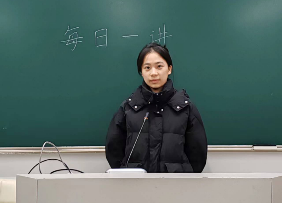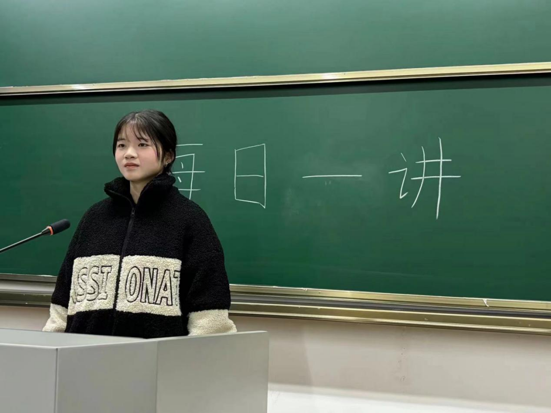 2023年12月28日,在国产a片 仓前校区慎园2号楼教室中,吕兰心同学在课前向同学们做以“延续红色基因,厚植爱国情怀”为主题的每日一讲活动。