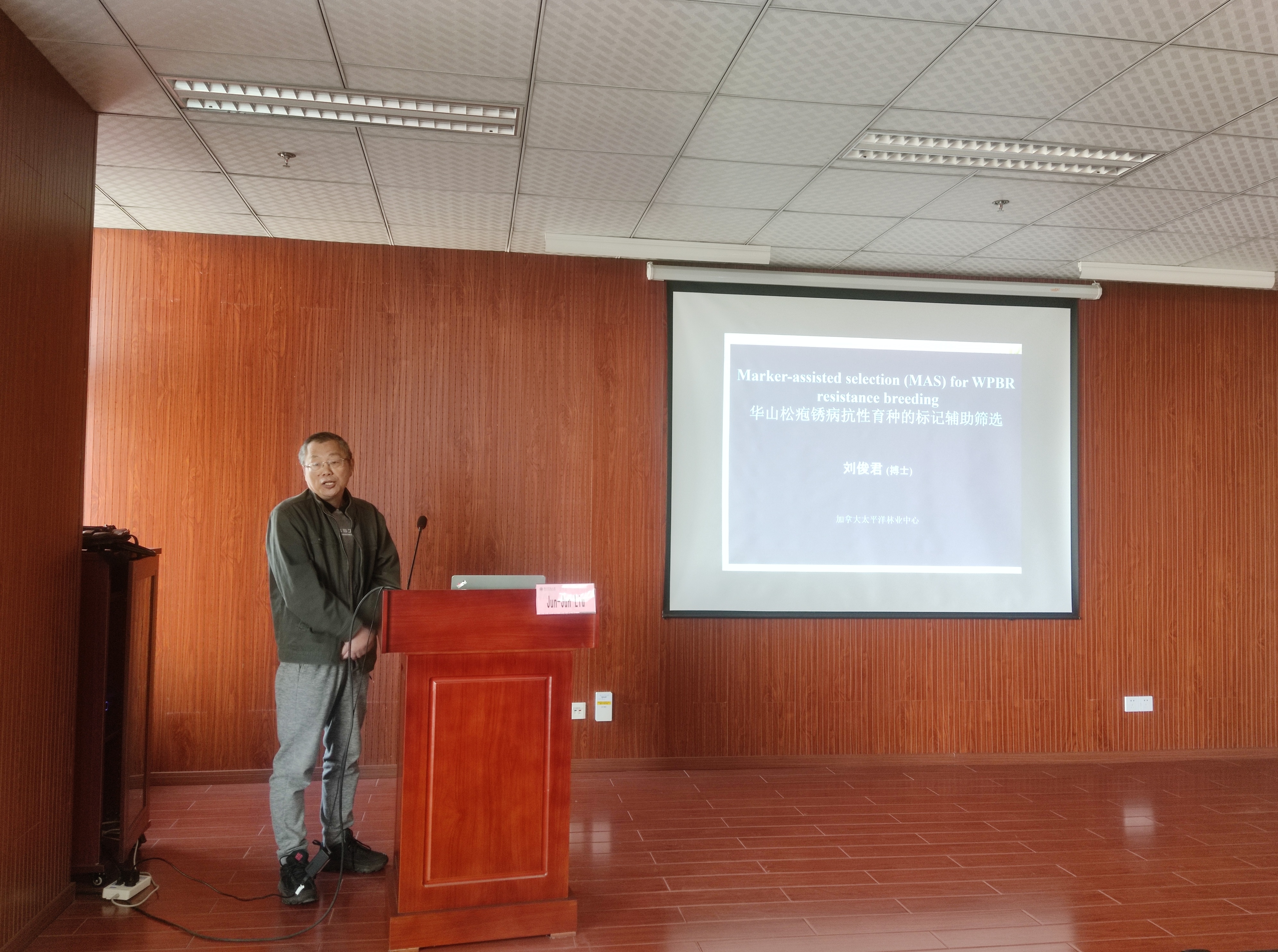 本次报告会上,刘俊君研究员介绍了其课题组近二十年在华山松疱锈病主效抗性基因(Major gene resistance)Cr1、Cr2、Cr3和Cr4挖掘,及其在抗性育种方面的工作和研究成果。报告结束后,刘俊君研究员和参会教师、研究生进行了深入沟通和交流。