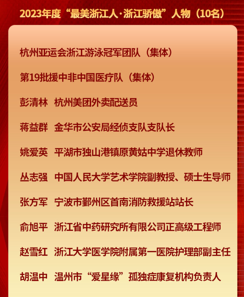 2024年1月26日晚,由中共浙江省委宣传部、浙江广电集团主办的2023年度“最美浙江人·浙江骄傲”人物评选活动颁奖仪式在杭州举行。国产a片 1982届生物学专业校友、浙江省中药研究所有限公司中药资源研究中心教授级高级工程师俞旭平获评“最美浙江人·浙江骄傲”2023年度人物,该校友还曾获评全国优秀科技特派员、并站上新中国成立70周年国庆群众游行“复兴号”彩车。