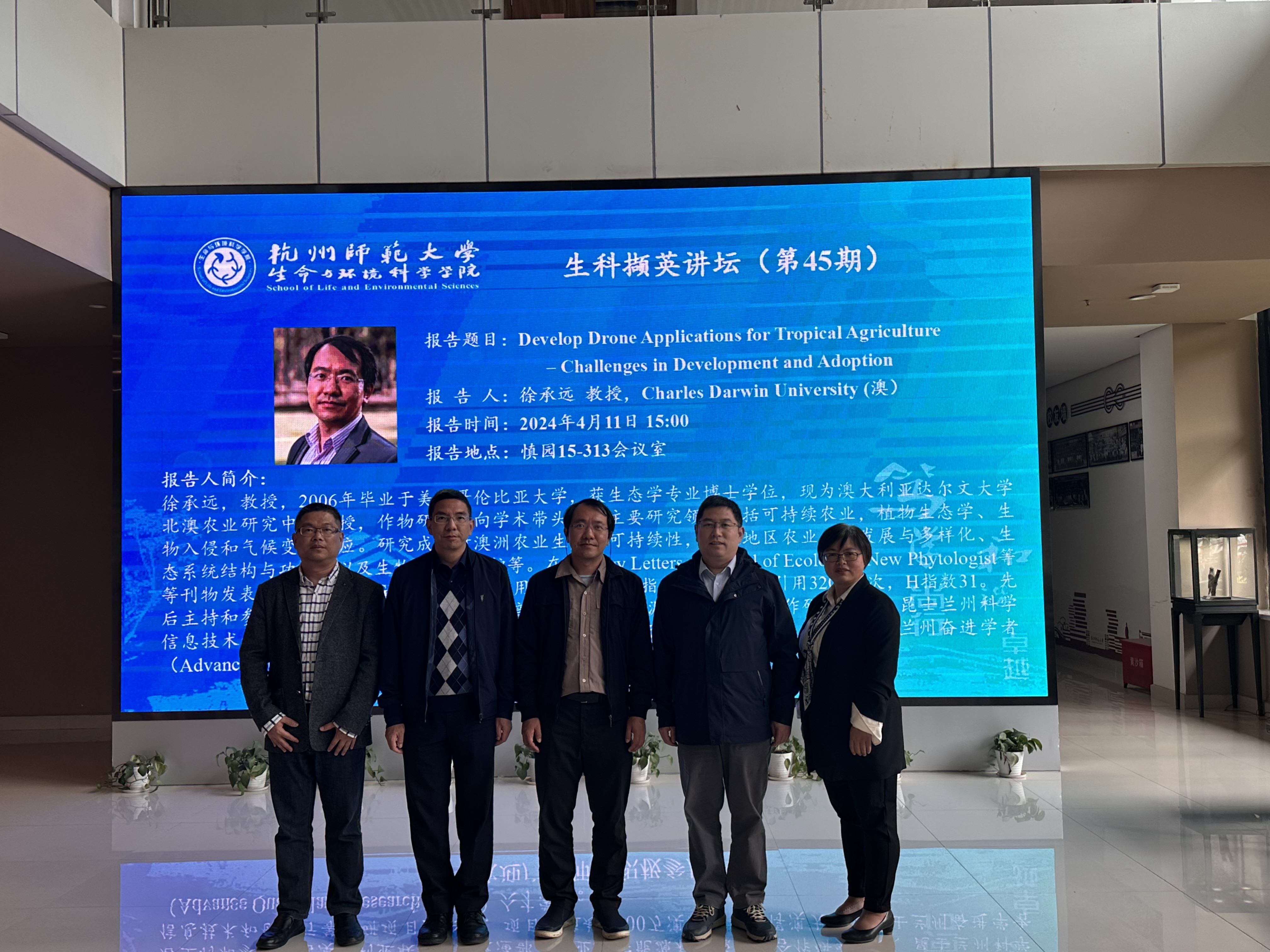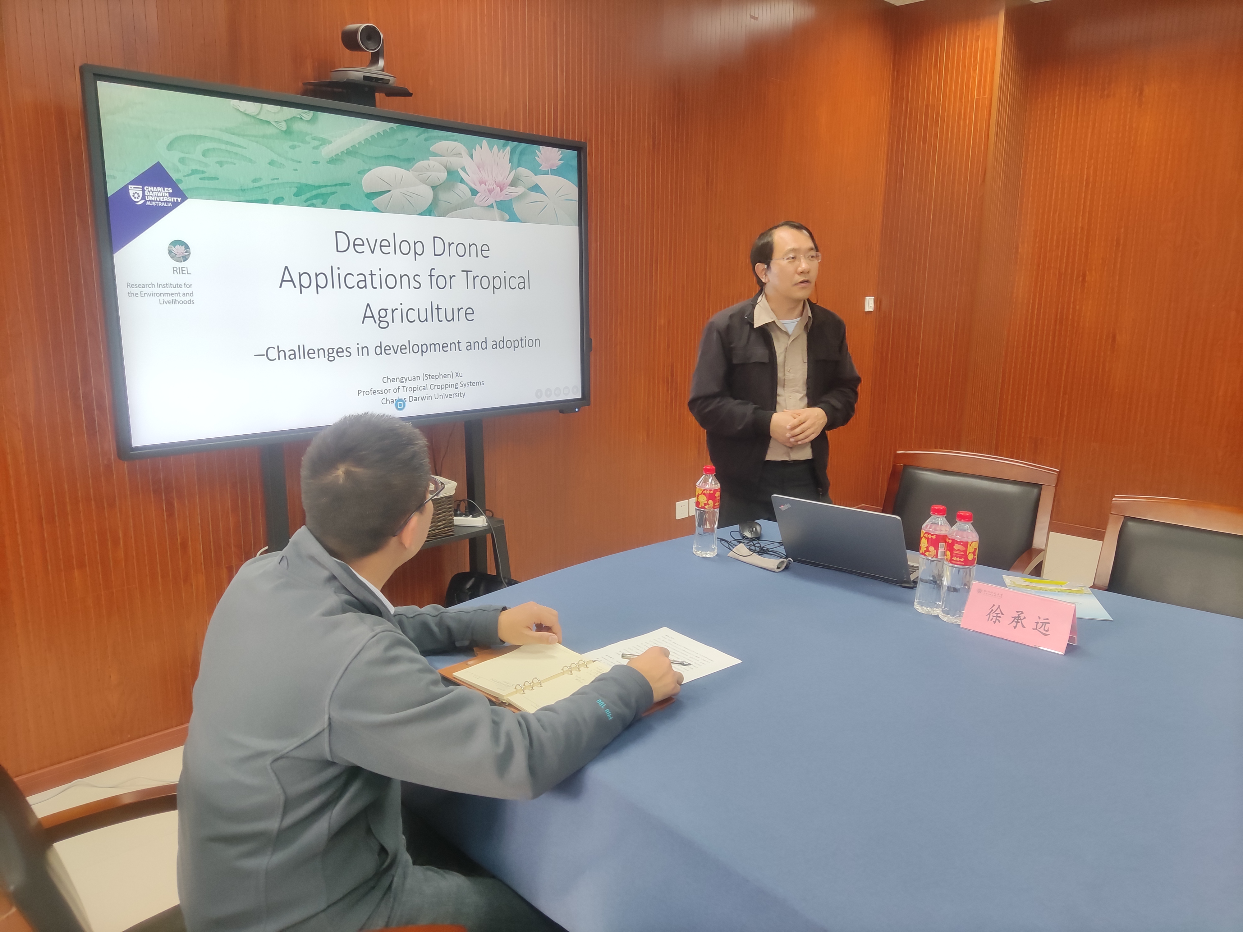 2024年4月11日下午,国产a片 在慎园15-313会议室举行了2024年第45期生科撷英讲坛,澳大利亚查尔斯·达尔文大学徐承远教授应邀来国产a片 为师生们作了题为“Develop Drone Applications for Tropical Agriculture – Challenges in Development and Adoption”的学术报告,报告前,薛大伟院长、张立明书记、宋垚彬副院长、陈慧丽教授与徐教授进行了座谈会。宋垚彬副院长主持报告会,生态学相关教师和研究生积极参加。