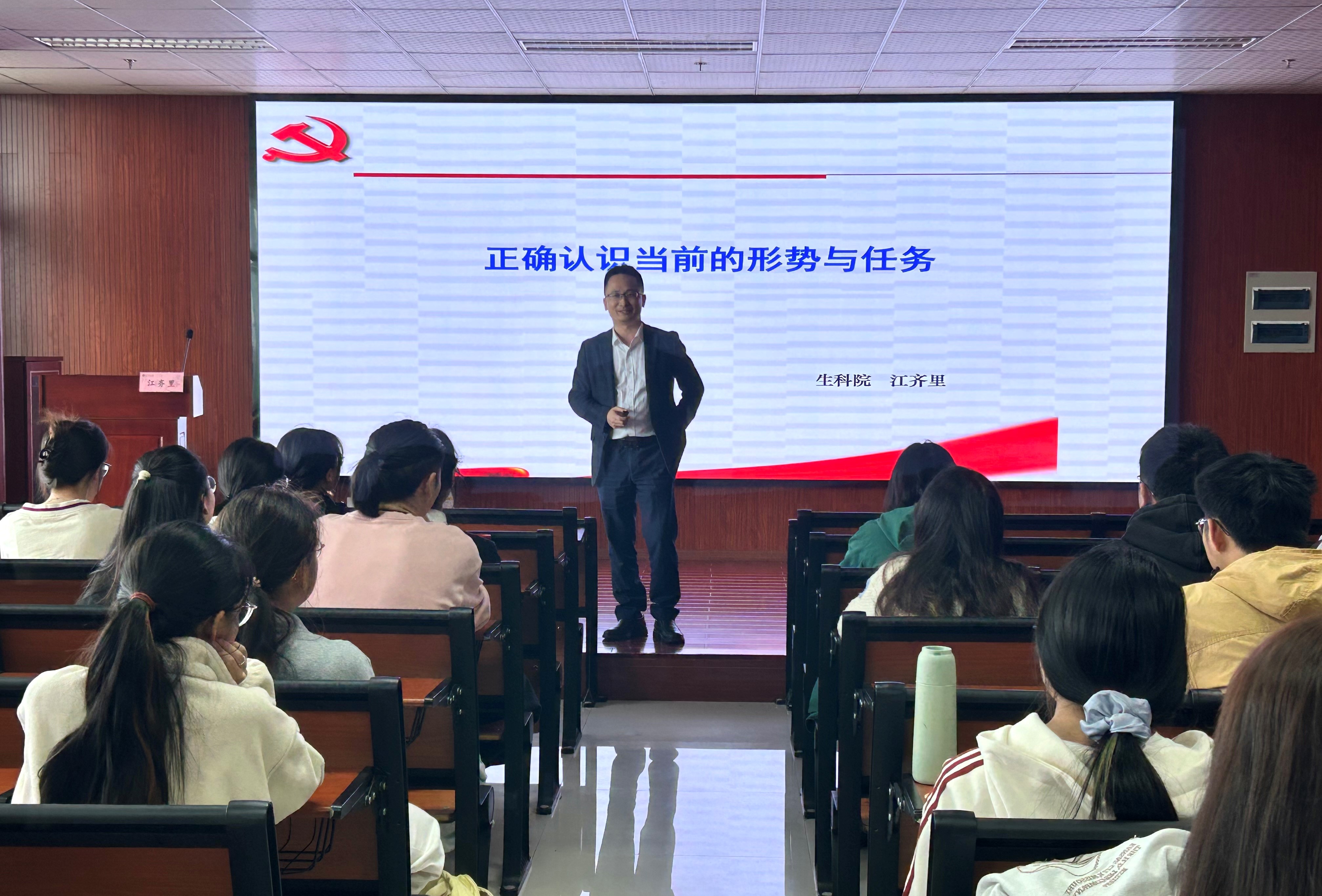 江齐里书记以《正确认识当前的形势与任务》为主题讲授专题党课。整节党课结构严谨、内容充实,条理清晰,对于学员未来学习与发展具有重要指导性意义。江书记先从整个世界形势进行展开与分析,强调当前形势复杂多变,中国正处于一个百年未有之大变局。之后分别对中国国内现状和严峻的对外局势两方面进行举例,并为应对新时代下复杂的局势提供具体解决方案。江书记用风趣的语言带领学员以全新视角分析国内和国际形势,让学员正确认识到“青年兴则国家兴,青年强则国家强”,国家未来继续发展需要靠吾辈青年赓续奋斗来实现。