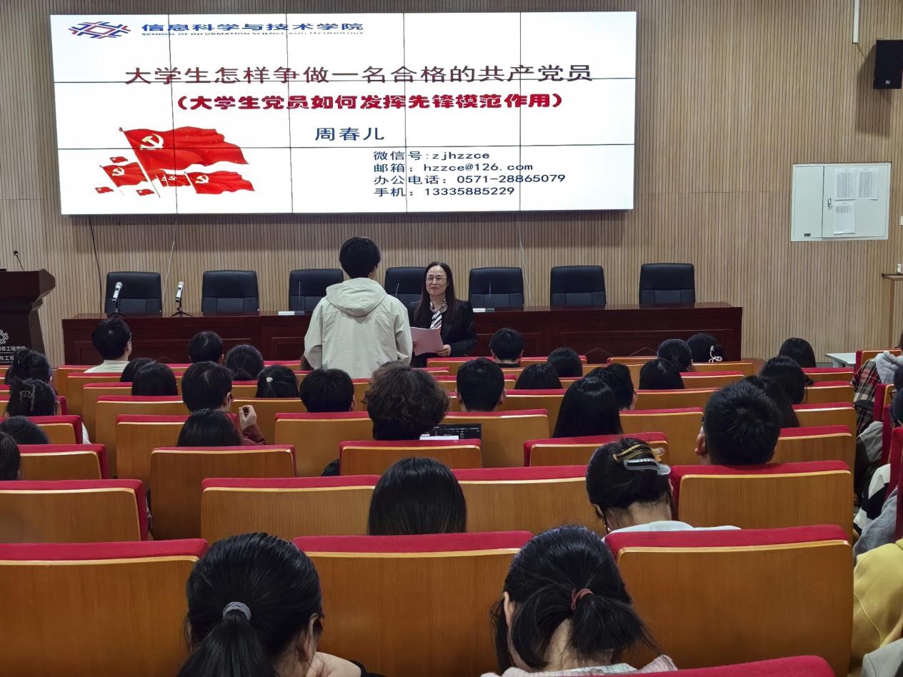 周春儿书记以《如何做一名合格的大学生党员》为主题作专题党课。首先,她以提问的形式与学生互动,近距离了解他们入党的动机。接着分析作为一名党员的基本要求,围绕党、政党、中国共产党的概念,党章的基本内容,党旗党徽的条例规定等强调党章的重要性。最后,以“大学生为什么要入党”这一问题为切入点,从“党的先进性”、“大学生的历史使命要求”、“入党发挥先锋模范作用”三个方面深入剖析,以此来激励同学们不断向一名合格的党员靠近。