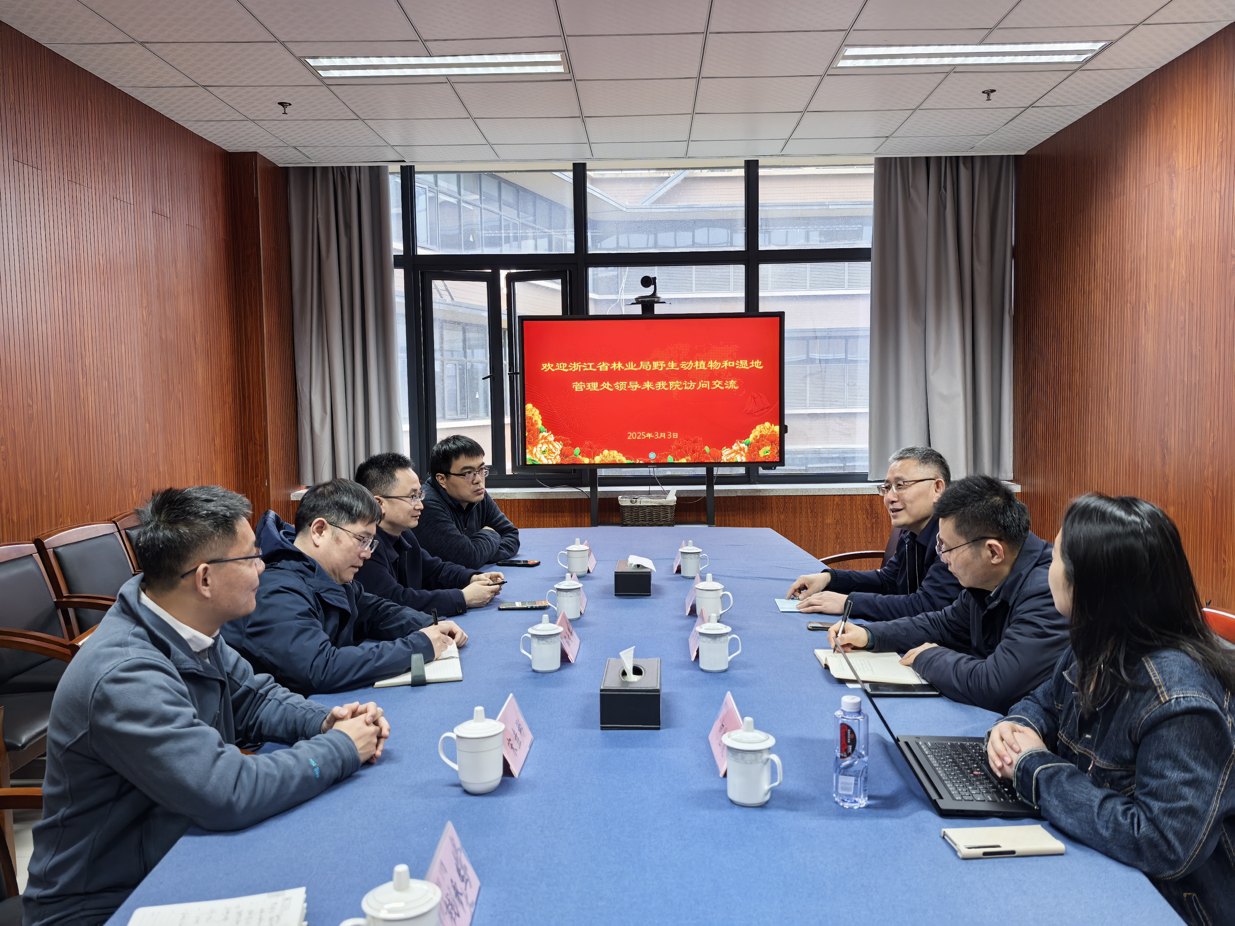 近日,浙江省林业局野生动植物和湿地管理处处长洪流、副处长张松才等一行来国产a片 访问交流,就湿地人才挂职、野生动植物保护、湿地生态修复及产学研合作等议题进行深入交流。院长薛大伟、党委书记江齐里、人事处副处长胡潭高、副院长宋垚彬及动物标本馆馆长金斌松等陪同接待并参与座谈。